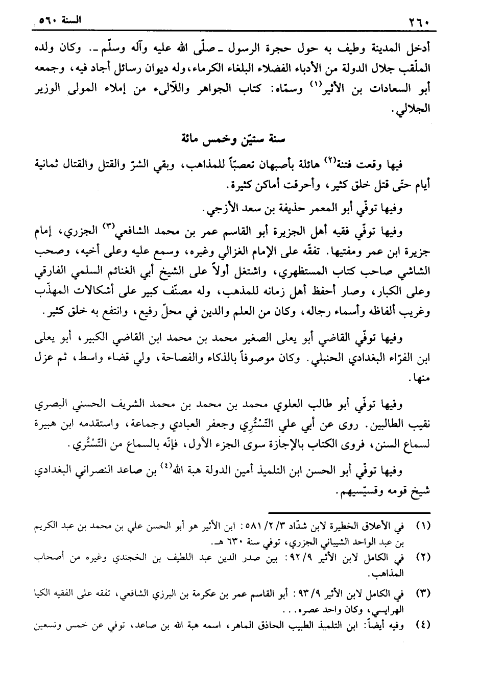 فيها وقعت فتنةهائلة بأصبهان تعصباً للمذاهب، وبقي الشر والقتل والقتال ثمانية أيام حتى قتل خلق كثير، وأحرقت أماكن كثيرة. وفيها توفي أبو المعمر حذيفة بن سعد الأزجي. وفيها توفي فقيه أهل الجزيرة أبو القاسم عمر بن محمد الشافعي الجزري، إمام جزيرة ابن عمر ومفتيها. تفقه على الإمام الغزالي وغيره، وسمع عليه وعلى أخيه، وصحب ألفاشي صاحب كتاب المستظهري، واشتغل أولاً على الشيخ أبي الغنائم السلمي ألفارقي وعلى الكبار، وصار أحفظ أهل زمانه للمذهب، وله مصنف كبيرعلى أشكالات المهذب وغريب ألفاظه وأسماء رجاله، وكان من العلم والدين في محل رفيع، وانتفع به خلق كثير. وفيها توفي القاضي أبو يعلى الصغير محمد بن محمد ابن القاضي الكبير، أبو يعلى ابن الفراء البغدادي الحنبلي. وكان موصوفاً بالذكاء والفصاحة، ولي قضاء واسط، ثم عزل منها. وفيها توفي أبو طالب العلوي محمد بن محمد بن محمد الشريف الحسني البصري نقيب ألفالبين. روى عن أبي علي التستري وجعفر العبادي وجماعة، واستقدمه ابن هبيرة لسماع السنن، فروى الكتاب بالإجازة سوى الجزء الأول، فإنه بالسماع من التستري. وفيها توفي أبو الحسن ابن التلميذ أمين الدولة هبة الله بن صاعد النصراني البغدادي شيخ قومه وقسيسيهم.