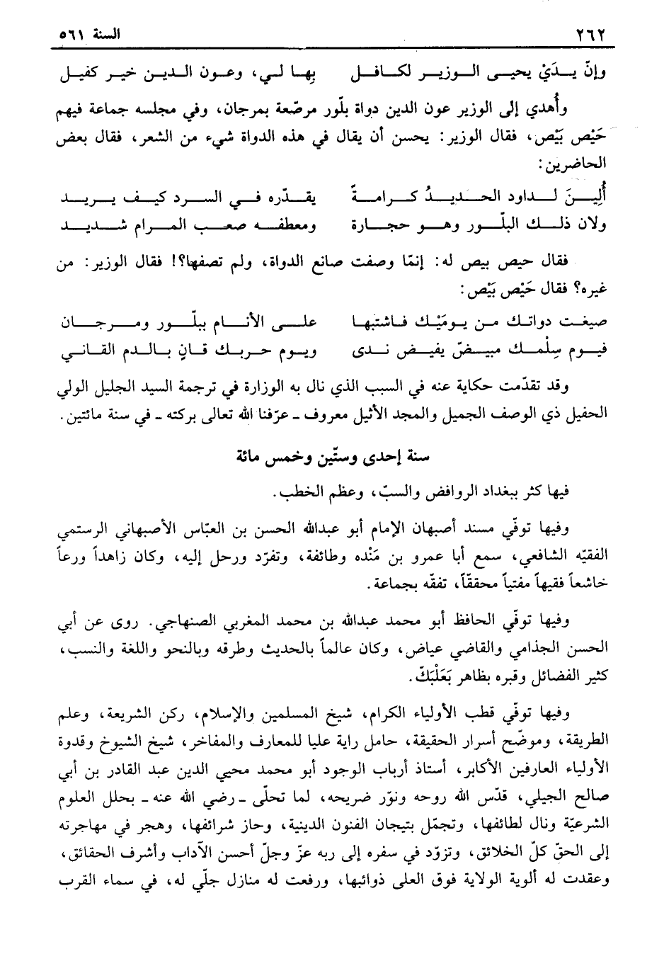 فيها كثر ببغداد إلىوافض والسب، وعظم الخطب. وفيها توفي مسند أصبهان الإمام أبو عبد الله الحسن بن العباس الأصبهاني إلىستمي الفقيه الشافعي، سمع أبا عمرو بن منده وطائفة، وتفرد ورحل إليه، وكان زاهداً ورعاً خاشعاً فقيهاً مفتياً محققاً، تفقه بجماعة. وفيها توفي الحافظ أبو محمد عبد الله بن محمد المغربي الصنهاجي. روى عن أبي الحسن الجذامي والقاضي عياض، وكان عألفا بالحديث وطرقه وبالنحو واللغة والنسب، كثير الفضائل وقبره بظاهر بعلبك. وفيها توفي قطب الأولياء الكرام، شيخ المسلمين والإسلام، ركن الشريعة، وعلم الطريقة، وموضح أسرار الحقيقة، حامل راية علما للمعارف والمفاخر، شيخ الشيوخ وقدوة الأولياء العارفين الأكابر، أستاذ أرباب الوجود أبو محمد محيي الدين عبد ألفادر بن أبي صالح الجيلي، قدس الله روحه ونور ضريحه، لما تحلى - رضي الله عنه - بحلل العلوم الشرعية ونال لمائفها، وتجمل بتيجان الفنون الدينية، وحاز شرائفها، وهجر في مهاجرته إلى الحق كل الخلائق، وتزود في سفره إلى ربه عز وجل أحسن الآداب وأشرف الحقائق، وعقدت له ألوية الولاية فوق العلى ذوائبها، ورفعت له منازل جلي له، في سماء القرب