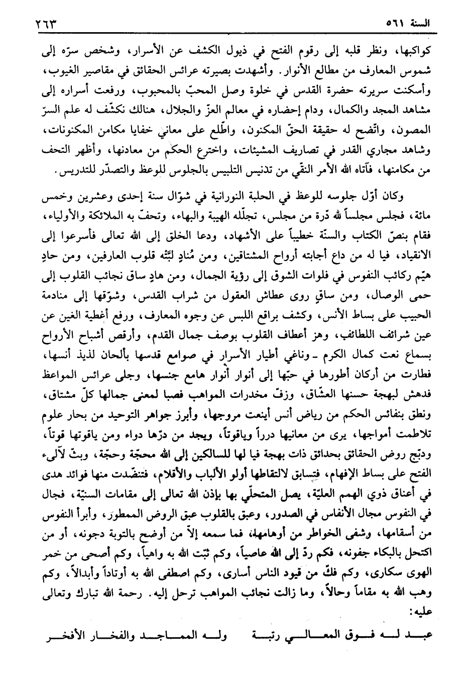 كواكبها، ونظر قلبه إلى رقوم الفتح في ذيول الكشف عن الأسرار، وشخص سره إلى شموس المعارف من مطالع الأنوار. وأشهدت بصيرته عرائس الحقائق في مقاصير الغيوب، وأسكنت سريرته حضرة القدس في خلوة وصل المحب بالمحبوب، ورفعت أسراره إلى مشاهد المجد والكمال، ودام إحضاره في معالم العز والجلال، هنالك نكشف له علم السر المصون، واتضح له حقيقة الحق المكنون، واطلع على معاني خفايا مكامن المكنونات، وشاهد مجاري القدر في تصاريف المشيئات، واخترع الحكم من معادنها، وأظهر التحف من مكامنها، فآتاه الله الأمر النقي من تدنيس التلبيس بالجلوس للوعظ والتصدر للتدريس. وكان أول جلوسه للوعظ في الحلبة النورانية في شوال سنة إحدى وعشرين وخمس مائة، فجلس مجلما لله درة من مجلس، تجلله الهيبة والبهاء، وتحف به الملائكة والأولياء، فقام بنص الكتاب والسنة خطيباً على الأشهاد، ودعا الخلق إلى الله تعالى فأسرعوا إلى الانقياد، فيا له من داع أجابته أرواح المشتاقين، ومن مناد لبته قلوب العارفين، ومن حاد هيم ركائب النفوس في فلوات الشوق إلى رؤية الجمال، ومن هاد ساق نجائب القلوب إلى حمى الوصال، ومن ساق روى عطاش العقول من شراب القدس، وشوقها إلى منادمة الحبيب على بساط الأنس، وكشف براقع اللبس عن وجوه المعارف، ورفع أغطية الغين عن عين شرائف اللمائف، وهز أعطاف القلوب بوصف جمال القدم، وأرقص أشباح الأرواح بسماع نعت كمال الكرم - وناغي أطيار الأسرار في صوامع قدسها بألفان لذيذ أنسها، فطارت من أركان أطورها في حبها إلى أنوار أنوار هامع جنسها، وجلى عرائس المواعظ فدهثى لبهجة حسنها العشاق، وزف مخدرات المواهب فصبا لمعنى جمالها كل مشتاق، ونطق بنفائس الحكم من رياض أنس أينعت مروجها، وأبرز جواهر التوحيد من بحار علوم تلاطمت أمواجها، يرى من معانيها درراً وياقوتاً، ويجد من درها دواء ومن ياقوتها قوتاً، ودبج روض الحقائق بحدائق ذات بهجة فيا لها للمالكين إلى الله محجة وحجة، وبث لآلىء الفتح على بساط الإفهام، فتسابق لالتقاطها أولو الألفاب والأقلام، فتنضدت منها فوائد هدى في أعناق ذوي الهمم العلية، يصل المتحلي بها بإذن الله تعالى إلى مقامات السنية، فجال في النفوس مجال الإنفاس في الصدور، وعبق بالقلوب عبق إلىوض الممطور، وأبرأ النفوس من أسقامها، وشفى الخواطر من أوهامها، فما سمعه إلا من أوضح بالتوبة دجونه، أو من اكتحل بالبكاء جفونه، فكم رد إلى الله عاصياً، وكم ثبت الله به واهياً، وكم أصحى من خمر الهوى سكارى، وكم فك من قيود الناس أسارى، وكم اصطفى الله به أوتاداً وأبدالاً، وكم وهب الله به مقاماً وحالاً، وما زالت نجائب المواهب ترحل إليه. رحمة الله تبارك وتعالى عليه: