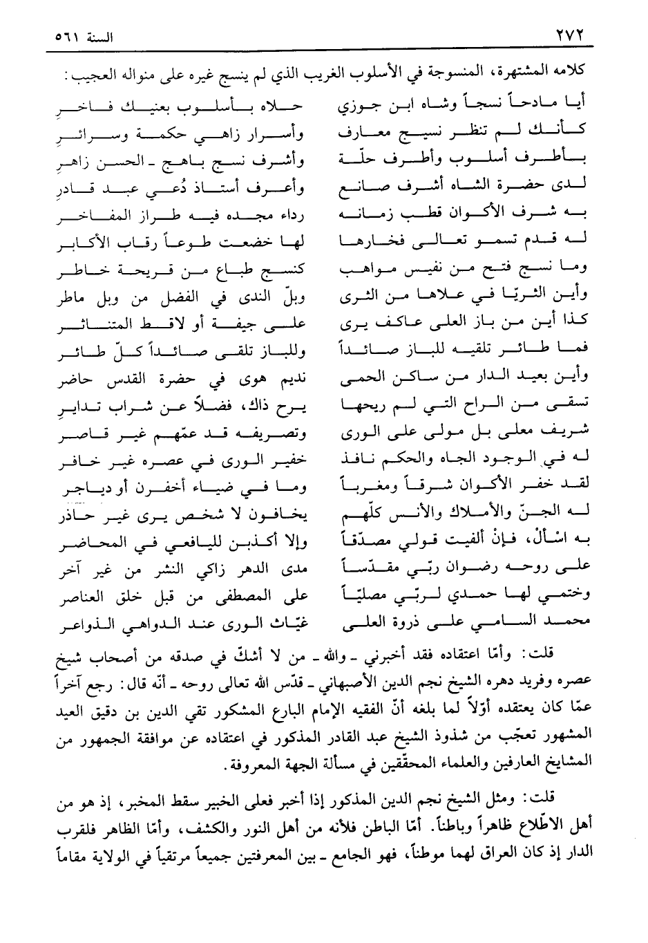 قلت: وأما اعتقاده فقد أخبرني - والله - من لا أشك في صدقه من أصحاب شيخ عصره وفريد دهره الشيخ نجم الدين الأصبهاني - قدس الله تعالى روحه - أنه قال: رجع آخراً عما كان يعتقده أولاً لما بلغه أن الفقيه الإمام ألفارع المشكور تقي الدين بن دقيق العيد المشهور تعجب من شذوذ الشيخ عبد ألفادر المذكور في اعتقاده عن موافقة الجمهور من المشايخ العارفين والعلماء المحققين في مسألة الجهة المعروفة. قلت: ومثل الشيخ نجم الدين المذكور إذا أخبر فعلى الخبير سقط المخبر، إذ هو من أهل الاطلاع ظاهراً وباطناً. أما ألفاطن فلأنه من أهل النور والكشف، وأما الظاهر فلقرب ألفار إذ كان العراق لهما موطناً، فهو الجامع - بين المعرفتين جميعاً مرتقياً في الولاية مقاماً