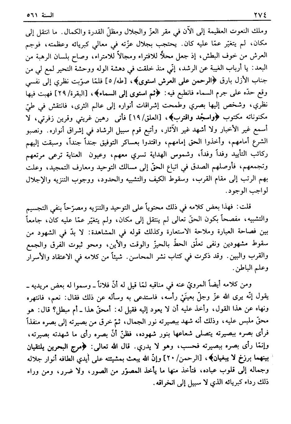 وملك النعوت العظيمة إلى الآن في مقر العز والجلال ومظل القدرة والكمال. ما انتقل إلى مكان، لم يتغير عما عليه كان. يحتجب بجلال عزته في معالي كبريأنه وعظمته، فوجم العرش من خوف البطش، إذ جعل محلاً للافتراء ومجالاً للامتراء، وصاح بلمان إلىهبة من البعد: يا أرباب الغيبة عن إلىشد، إني منذ خلقت في دهشة الوله ووحشة التحير لمع لي من جناب الأزل بارق " إلىحمن على العرش استوى "، - طه 5 - فلما صوبت نظري إلى نفسي وقع حده على جرم السماء فانطبع فيه: " ثم استوى إلى السماء "، - البقرة 29 - فهبت فيها نظري، وشخص إليها بصري وطمحت إشراقات أنواره إلى عالم الثرى، فانتقش في طي مكنوناته مكتوب " واسجد واقترب "، - العلق 19 - فأتى رهين غريتي وقرين زفرتي، لا أسمع غير الأخبار ولا أشهد غير الآثار، وأتبع قوم سبيل إلىشاد في إشراق أنواره. ونصبو الشرع أمامهم، وأخذوا الحق إمامهم، واقتدوا بعساكر التوفيق