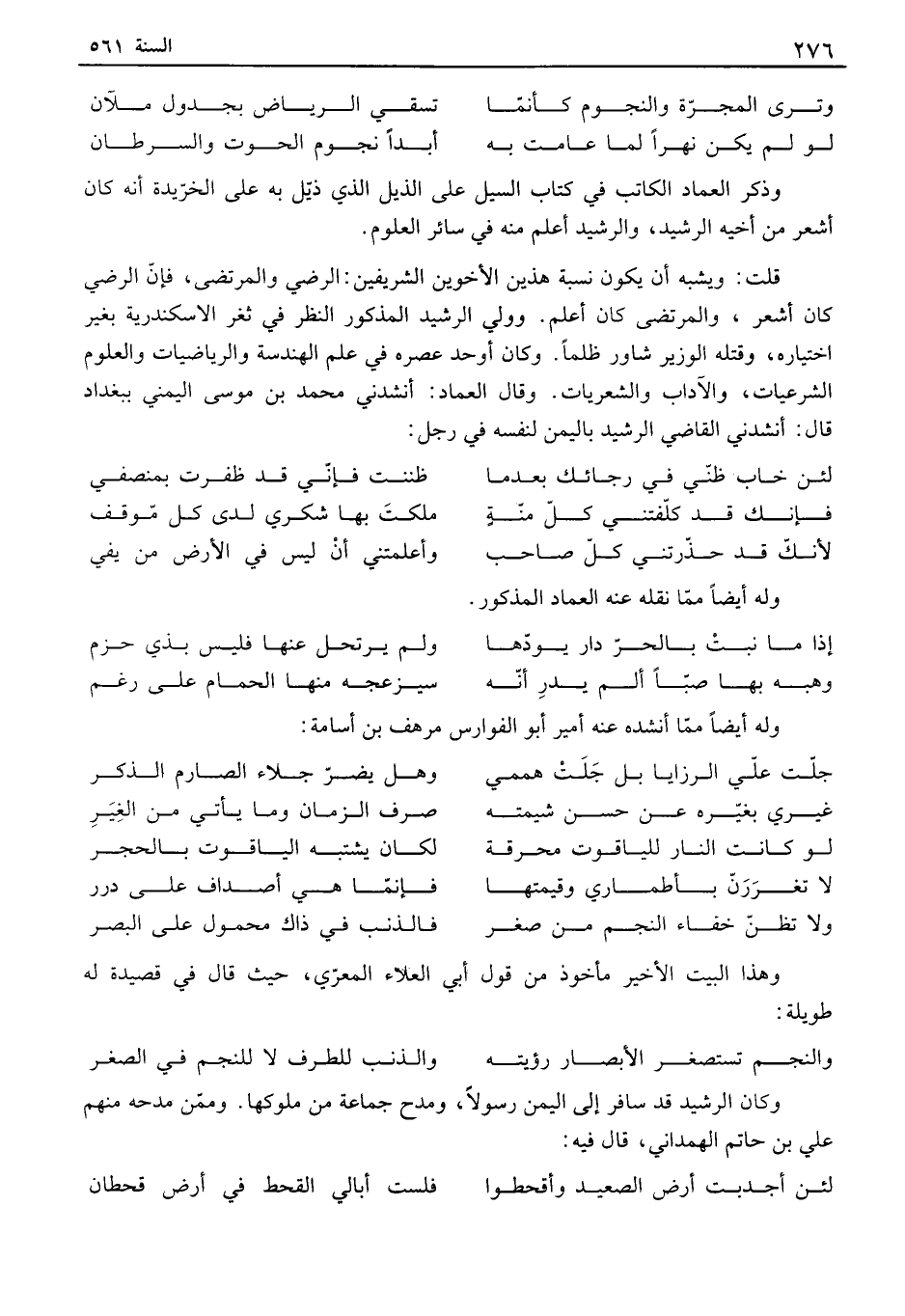 وذكر العماد ألفاتب في كتاب السيل على الذيل الذي ذيل به على الخريدة أنه كان أشعر من أخيه الرشيد، والرشيد أعلم منه في سائر العلوم. قلت: ويشبه أن يكون نسبة هذين الأخوين الشريفين: إلىضي والمرتضى، فإن إلىضي كان أشعر، والمرتضى كان أعلم. وولي الرشيد المذكور النظر في ثغر الاسكندرية بغير اختياره، وقتله الوزير شاور ظلماً وكان أوحد عصره في علم الهندسة والرياضيات والعلوم الشرعيات، والآداب والشعريات. وقال العماد: أنشدني محمد بن موسى اليمني ببغداد قال: أنشدني القاضي الرشيد باليمن لنفسه في رجل: