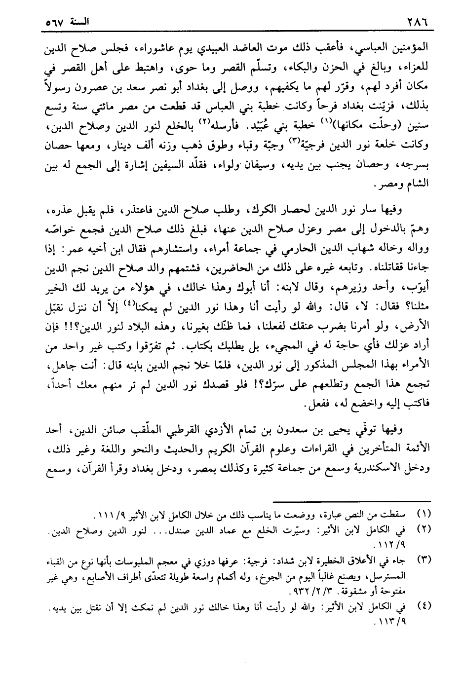 المؤمنين العباسي، فأعقب ذلك موت العاضد العبيدي يوم عاشوراء، فجلس صلاح الدين للعزاء، وبالغ في الحزن والبكاء، وتسلم القصر وما حوى، واهتبط على أهل القصر في مكان أفرد لهم، وقرر لهم ما يكفيهم، ووصل إلى بغداد أبو نصر سعد بن عصرون رسولاً بذلك، فزينت بغداد فرحاً وكانت خطبة بني العباس قد قطعت من مصر مائتي سنة وتسع سنين وحلت مكانها خطبة بني عبيد. فأرسله بالخلع لنور الدين وصلاح الدين، وكانت خلعة نور الدين فرجية وجبة وقباء وطوق ذهب وزنه ألف دينار، ومعها حصان بسرجه، وحصان يجنب بين يديه، وسيفان ولواء، فقفد السيفين إشارة إلى الجمع له بين الشام ومصر. وفيها سار نور الدين لحصار الكرك، وطلب صلاح الدين فاعتذي، فلم يقبل عذره، وهم بالدخول إلى مصر وعزل صلاح الدين عنها، فبلغ ذلك صلاح الدين فجمع خواصه وواله وخاله شهاب الدين ألفارمي في جماعة أمراء، واستشارهم فقال ابن أخيه عمر: إذا جاءنا ققاتلناه. وتابعه غيره على ذلك من ألفاضرين، فشتمهم والد صلاح الدين نجم الدين أيوب، وأحد وزيرهم، وقال لابنه: أنا أبوك وهذا خالك، في هؤلاء من يريد لك الخير مثلنا؟ فقال: لا، قال: والله لو رأيت أنا وهذا نور الدين لم يمكنا إلا أن ننزل نقبل الأرض، ولو أمرنا بضرب عنقك لفعلنا، فما ظنك بغيرنا، وهذه البلاد لنور الدين؟! ! فإن أراد عزلك فأي حاجة له في المجيء، بل يطلبك بكتاب. ثم تفرقوا وكتب غير واحد من الأمراء بهذا المجلس المذكور إلى نور الدين، فلما خلا نجم الدين بابنه قال: أنت جاهل، تجمع هذا الجمع وتطلعهم على سرك؟! فلو قصدك نور الدين لم تر منهم معك أحداً، فاكتب إليه واخضع له، ففعل. وفيها توفي يحيى بن سعدون بن تمام الأزدي القرطبي الملقب صائن الدين، أحد الأئمة المتأخرين في القراءات وعلوم القرآن الكريم والحديث والنحو واللغة وغير ذلك، ودخل الاسكندرية وسمع من جماعة كثيرة وكذلك بمصر، ودخل بغداد وقرأ القران، وسمع