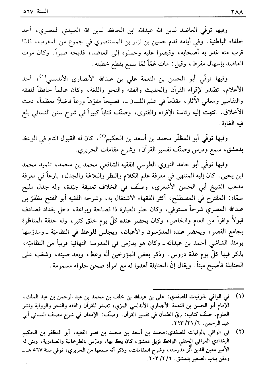 وفيها توفي العاضد لدين الله عبد الله ابن الحافظ لدين الله العبيدي المصري، أحد خلفاء ألفاطنية. وفي أيامه قدم حسين بن نزار بن المستنصري في جموع من المغرب، فلما قرب منه غدر به أصحابه، وقبضوا عليه وحملوه إلى العاضد، فذبحه صبراً. وكان موت العاضد بإسهال مفرط، وقيل: مات غماً لما سمع بقطع خطبته. وفيها توفي أبو الحسن بن النعمة على بن عبد الله الأنصاري الأندلسي، أحد الأعلام، تصدر لإقراء القرآن والحديث الفقه والنحو واللغة، وكان عألفا حافظاً للفقه والتفاسير ومعاني الآثار، مقدماً في علم اللمان -، فصيحاً مفوهاً ورعاً فاضلاً معظماً، دمث الأخلاق. انتهت إليه رئاسة الإقراء والفتوى، وصنف كتاباً كبيراً في شرح سنن النسائي بلغ فيه الداية. وفيها توفي أبو المظفر محمد بن أسعد بن الحكي، كان له القبول الشام في الوعظ بدمشق، سمع ودرس وصنف تفسير القرآن، وشرح مقامات الحريري. وفيها توفي أبو حامد النووي الطوسي الفقيه الشافعي محمد بن محمد، تلميذ محمد ابن يحيى. كان إليه المنتهى في معرفة علم الكلام والنظر والبلاغة والجدل، بارعاً في معرفة مذهب الشيخ أبي الحسن الأشعري، وصنف في الخلاف تعليقة جيدة، وله جدل مليح سماه: المقترح في المصطلح، أكثر الفقهاء الاشتغال به، وشرحه الفقيه أبو الفتح مظفز بن عبد الله المصري شرحاً مستوفي، وكان حلو العبارة ذا فصاحة وبراعة، دخل بغداد فصادف قبولاً وافراً من الشام وألفاص، وكان يحضر عنده كل يوم خلق كثير، وله حلقة المناظرة بجامع القصر، ويحضر عنده المدرسون والأعيان، ويجلس للوعظ في النظامتة - ومدرسها يومئذ ألفاشي أحمد بن عبد الله - وكان هو يدرس في المدرسة النهائية قريباً من النظامية، يذكر فيها كل يوم عدة دروس. وذكر بعض المؤرخين أنه وعظ، وبعد صيته، وشغب على الحنابلة فأصبح ميتاً ويقال إن الحنابلة أهدوا له مع امرأة صحن حلواء مسمومة.