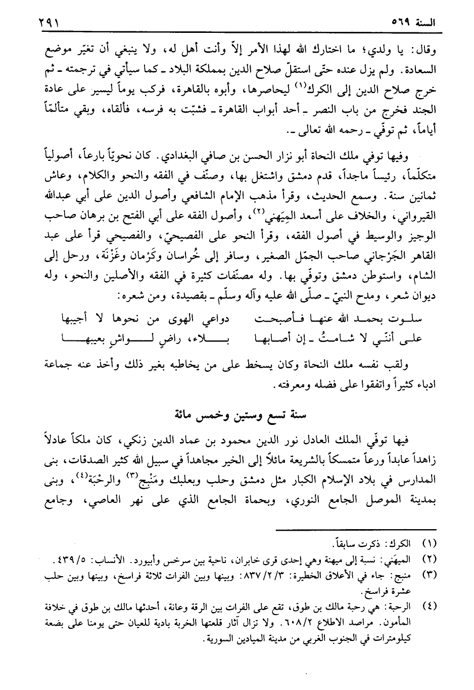 وقال: يا ولدي؛ ما اختارك الله لهذا الأمر إلا وأنت أهل له، ولا ينبغي أن تغير موضع السعادة. ولم يزل عنده حتى استقل صلاح الدين بمملكة البلاد - كما سيأتي في ترجمته - ثم خرج صلاح الدين إلى الكرك ليحاصرها، وأبوه بالقاهرة، فركب يوماً ليسير على عادة الجند فخرج من باب النصر - أحد أبواب القاهرة - فشبت به فرسه، فألقاه، وبقي متألفا أياماً، ثم توفي - رحمه الله تعالى -. وفيها توفي ملك النحاة أبو نزار الحسن بن صافي البغدادي. كان نحوياً بارعاً، أصولياً متكلماً، رئيساً ماجداً، قدم دمشق واشتغل بها، وصنف في الفقه والنحو والكلام، وعاش ثمانين سنة. وسمع الحديث، وقرأ مذهب الإمام الشافعي وأصول الدين على أبي عبد الله القيرواني، والخلاف على أسعد الميهن، وأصول الفقه على أبي الفتح بن برهان صاحب الوجيز والوسيط في أصول الفقه، وقرأ النحو على الفصيحي، والفصيحي قرأ على عبد القاهر الجرجاني صاحب الجمل الصغير، وسافر إلى خراسان وكرمان وغزنة، ورحل إلى الشام، واستوطن دمشق وتوفي بها. وله مصنفات كثيرة في الفقه والأصلين والنحو، وله ديوان شعر، ومدح النبي - صلى الله عليه وآله وسلم - بقصيدة، ومن شعره: