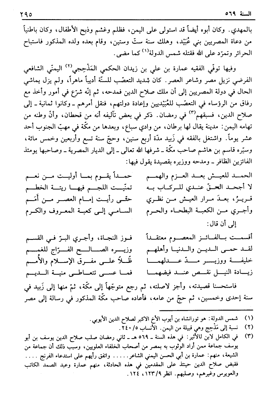 بالمهدي. وكان أبوه أيضاً قد استولى على اليمن، فظلم وغشم وذبح الأطفال، وكان باطنياً من دعاة المصريين بني عبيد، وهلك سنة ست وستين، وقام بعده ولده المذكور فاستباح الحرائر وتمرد على الله فقتله شمس الدولة كما مضى. وفيها توفي الفقيه عمارة بن علي بن زيدان الحكمي المذحجي اليمني الشافعي الفرضي نزيل مصر وشاعر العصر. كان شديد التعصب للسنة أديباً