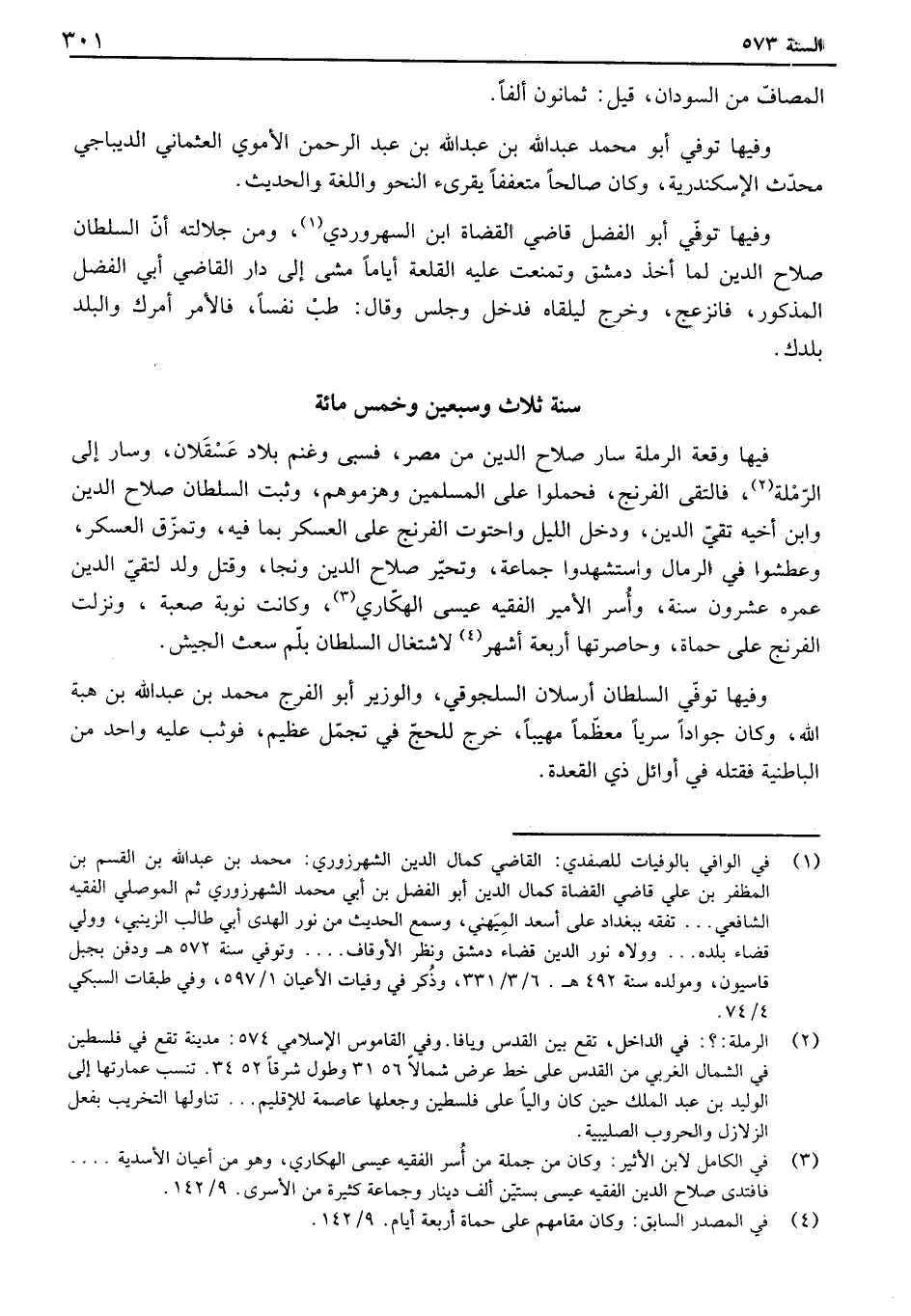 المصاف من السودان، قيل: ثمانون ألفاً. وفيها توفي أبو محمد عبد الله بن عبد الله بن عبد الرحمن الأموي العثماني الديباجي محدث الإسكندرية، وكان صالحاً متعففاً يقرىء النحو واللغة والحديث. وفيها توفي أبو الفضل قاضي القضاة ابن السهروردي، ومن جلالته أن السلطان صلاح الدين لما أخذ دمشق وتمنعت عليه القلعة أياماً مشى إلى دار القاضي أبي الفضل المذكور، فانزعج، وخرج ليلقاه فدخل وجلس وقال: طب نفساً، فالأمر أمرك والبلد بلدك.