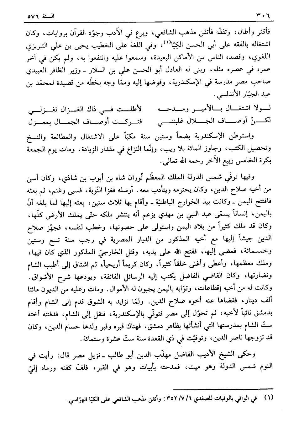 واستوطن الإسكندرية بضعاً وستين سنة مكباً على الاشتغال والمطالعة والنسخ وتحصيل الكتب، وجاوز المائة بلا ريب، وإنما النزاع في مقدار الزيادة، ومات يوم الجمعة بكرة الخامس ربيع الآخر رحمه الله تعالى. وفيها توفي شمس الدولة الملك المعظم توران شاه بن أيوب بن شاذي، وكان أسن من أخيه صلاح الدين، وكان يحترمه ويتأدب معه. أرسله فغزا النوبة، فسبى وغنم، ثم بعثه فافتتح اليمن - وكانت بيد الخوارج الباطنية - وأقام بها ثلاث سنين، بعثه إليها لما بلغه أن باليمن، إنساناً يسمى عبد النبي بن مهدي يزعم أنه ينتشر ملكه حتى يملك الأرض كلها، وكان قد ملك كثيراً من بلاد اليمن واستولى على حصونها، وخطب لنفسه، فجهز صلاح الدين جيشاً إليها مع أخيه المذكور من الديار المصرية في رجب سنة تسع وستين وخمسمائة، فمضى إليها، ففتح الله على يديه، وقتل الخارجي المذكور الذي كان فيها، وملك معظمها، وأعطى وأغنى خلقاً كثيراً، وكان كريماً أريحياً، ثم اشتاق إلى أطيب الشام ونضارتها، وكان القاضي الفاضل يكتب إليه الرسائل الفائقة، ويودعها شرح الأشواق. وكانت له من أخيه إقطاعات، وتوابه باليمن يجبون له الأموال. ومات وعليه من الديون مائتا ألف دينار، فقضاها عنه أخوه صلاح الدين. ولما تزايد به الشوق قدم إلى الشام وأقام بدمشق نائباً لأخيه، ثم تحول إلى مصر فتوفي بالإسكندرية، فنقل إلى الشام، فدفنته أخته ست الشام بمدرستها التي أنشأتها بظاهر دمشق، فهناك قبره وقبر ولدها حسام الدين، وكان قد تزوجها ناصر الدين، وتوفيت في ذي القعدة سنة ست عشرة وستمائة. وحكى الشيخ الأديب الفاضل مهذب الدين أبو طالب - نزيل مصر قال: رأيت في النوم شمس الدولة وهو ميت، فمدحته بأبيات وهو في القبر، فلف كفنه ورماه إلي