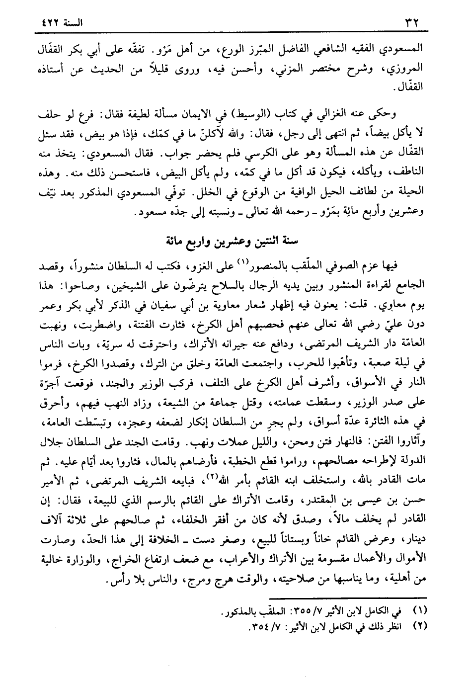 فيها عزم الصوفي الملقب بالمنصور على الغزو، فكتب له السلطان منشوراً، وقصد الجامع لقراءة المنشور وبين يديه الرجال بالسلاح يترضون على الشيخين، وصاحوا: هذا يوم معاوي. قلت: يعنون فيه إظهار شعار معاوية بن ابي سفيان في الذكر لإبي بكر وعمر دون علي رضي الله تعالى عنهم فحصبهم أهل الكرخ، فسارت الفتنة، واضطربت، ونهبت العامة دار الشريف المرتضى، ودافع عنه جيرانه الأتراك، واحترقت له سرية، وبات الناس في ليلة صعبة، وتأهبوا للحرب، واجتمعت العامة وخلق من الترك، وقصدوا الكرخ، فرموا النار في الأسواق، وأشرف أهل الكرخ على التلف، فركب الوزير والجند، فوقعت آجره على صدر الوزير، وسقطت عمامته، وقتل جماعة من الشيعة، وزاد النهب فيهم، واحرق في هذه السائرة عدة اسواق، ولم يجر من السلطان إنكار لضعفه وعجزه، وتبسطت العامة، وآثاروا الفتن: فالنهار فتن ومحن، والليل عملات ونهب. وقامت الجند على السلطان جلال الدولة لإطراحه مصالحهم، وراموا قطع الخطبة، فارضاهم بالمال، فساروا بعد أيام عليه. وثم مات القادر بالله، واستخلف ابنه القائم بأمر الله، فبايبعه الشريف المرتضى، ثم الأمير حسن بن عيسى بن المقتدر، وقامت الأتراك على القائم بالرسم الذي للبيعة، فقال: إن القادر لم يخلف مالاً، وصدق لأنه كان من أفقر الخلفاء، ثم صالحهم على ثلاثة ألاف دينار، وعرض القائم خاناً وبستاناً للبيع، وصغر دست - الخلافة إلى هذا الحد، وصارت الأموال والأعمال مقسومة بين الأتراك والأعراب، مع ضعف ارتفاع الخراج، والوزارة خالية من أهلية، وما يناسبها من صلاحيته، والوقت هرج ومرج، والناس بلا رأس.