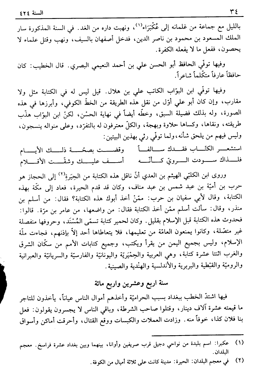 بالليل مع جماعة من غلمانه إلى عكبراء، ونهبت داره من الغد. في السنة المذكورة سار الملك المسعود بن محمود بن ناصر الدين، فدخل أصفهان بالسيف، ونهب وقتل علماء لا يحصون، ففعل ما لا يفعله الكفرة. وفيها توفي الحافظ أبو الحسن علي بن أحمد النعيمي البصري. قال الخطيب: كان حافظاً عارفاً متكلماً شاعراً. وفيها توفي ابن البواب الكاتب علي بن هلال. قيل ليس له في الكتابة مثل ولا مقارب، وإن كان أبو علي أول من نقل هذه الطريقة من الخط الكوفي، وأبرزها في هذه الصورة، وله بذلك فضيلة السبق، وخطه أيضاً في نهاية الحسن، لكن ابن البواب هذب طريقته، ونقاها، وكساها حلاوة وبهجة، والكل معترفون له بالتفرد، وعلى منواله ينسجون، وليس فيهم من يلحق شأنه، ولما توفي رثي بهذين البيتين: