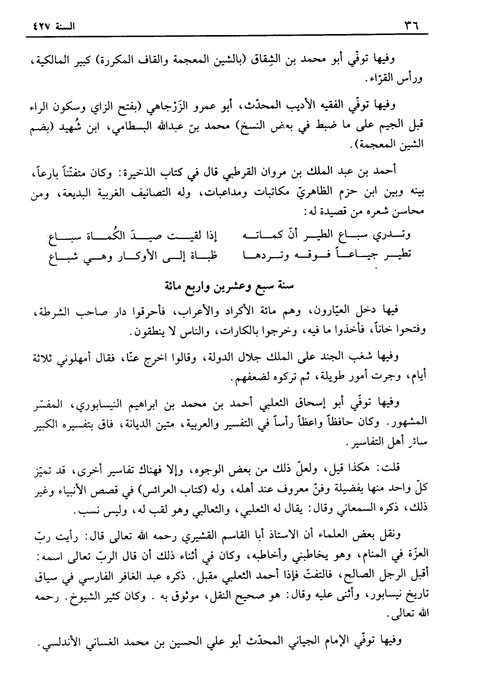 وفيها توفي أبو إسحاق الثعلبي أحمد بن محمد بن ابراهيم النيسابوري، المفسر المشهور. وكان حافظاً واعظاً رأساً في التفسير والعربية، متين الديانة، فاق بتفسيره الكبير سائر أهل التفاسير. قلت: هكذا قيل، ولعل ذلك من بعض الوجوه، وإلا فهناك تفاسير أخرى، قد تميز كل واحد منها بفضيلة وفن معروف عند أهله، وله كتاب العرائس في قصص الأنبياء وغير ذلك، ذكره السمعاني وقال: يقال له الثعلبي، والثعالبي وهو لقب له، وليس نسب. ونقل بعض العلماء أن الاستاذ أبا القاسم القشيري رحمه الله تعالى قال: رأيت رب العزة في المنام، وهو يخاطبني وأخاطبه، وكان في أثناء ذلك أن قال الرب تعالى اسمه: أقبل الرجل الصالح، فالتفت فإذا أحمد الثعلبي مقبل. ذكره عبد الغافر الفارسي في سياق تاريخ نيسابور، وأثنى عليه وقال: هو صحيح النقل، موثوق به. وكان كثير الشيوخ. رحمه ته تعالى. وفيها توفي الإمام الجياني المحدث أبو علي الحسين بن محمد الغساني الأندلسي.