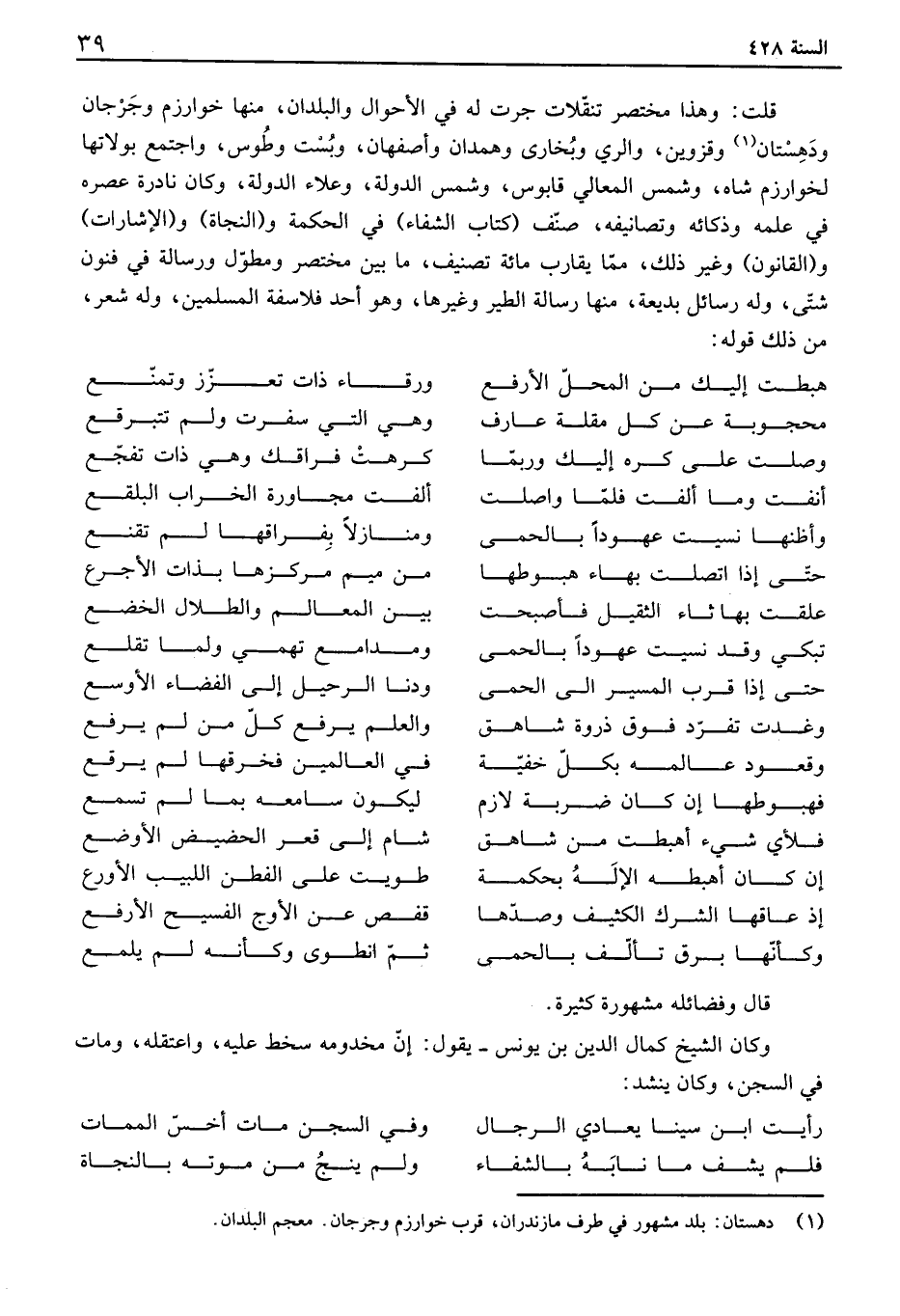 قلت: وهذا مختصر تنقلات جرت له في الأحوال والبلدان، منها خوارزم وجرجان ودهستان وقزوين، والري وبخارى وهمدان وأصفهان، وبست وطوس، واجتمع بولاتها لخوارزم شاه، وشمس المعالي قابوس، وشمس الدولة، وعلاء الدولة، وكان نادرة عصره في علمه وذكائه وتصانيفه، صنف كتاب الشفاء في الحكمة والنجاة والإشارات والقانون وغير ذلك، مما يقارب مائة تصنيف، ما بين مختصر ومطول ورسالة في فنون شتى، وله رسائل بديعة، منها رسالة الطير وغيرها، وهو أحد فلاسفة المسلمين، وله شعر، من ذلك قوله: