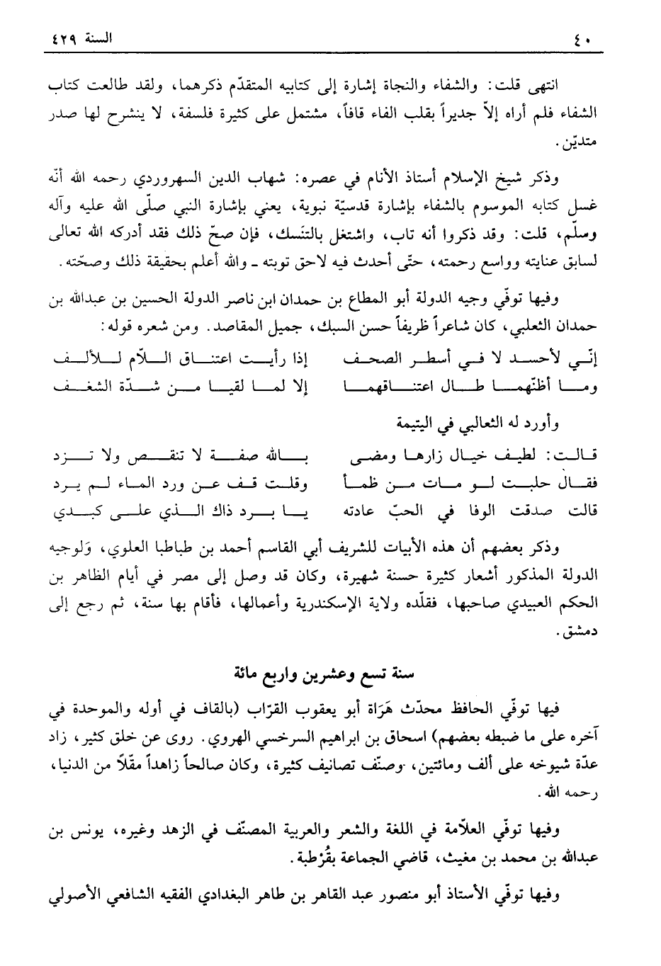 انتهى قلت: والشفاء والنجاة إشارة إلى كتابيه المتقدم ذكرهما، ولقد طالعت كتاب الشفاء فلم أراه إلا جديراً بقلب الفاء قافاً، مشتمل على كثيرة فلسفة، لا ينشرح لها صدر متدين. وذكر شيخ الإسلام أستاذ الأنام في عصره: شهاب الدين السهروردي رحمه الله أنه غسل كتابه الموسوم بالشفاء بإشارة قدسية نبوية، يعني بإشارة النبي صلى الله عليه وآله وسلم، قلت: وقد ذكروا أنه تاب، واشتغل بالتنسك، فإن صح ذلك فقد أدركه الله تعالى لسابق عنايته وواسع رحمته، حتى أحدث فيه لاحق توبته - والله أعلم بحقيقة ذلك وصحته. وفيها توفي وجيه الدولة أبو المطاع بن حمدان ابن ناصر الدولة الحسين بن عبد الله بن حمدان الثعلبي، كان شاعراً ظريفاً حسن السبك، جميل المقاصد. ومن شعره قوله: