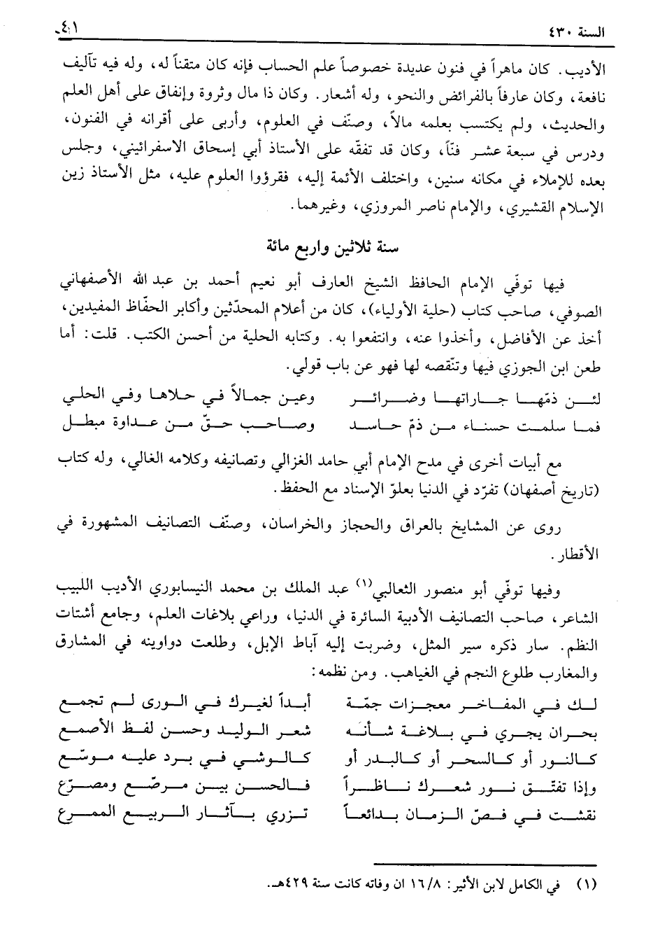 مع أبيات أخرى في مدح الإمام أبي حامد الغزالي وتصانيفه وكلامه الغالي، وله كتاب تاريخ أصفهان تفرد في الدنيا بعلو الإسناد مع الحفظ. روى عن المشايخ بالعراق والحجاز والخراسان، وصنف التصانيف المشهورة في الأقطار. وفيها توفي أبو منصور الثعالبي عبد الملك بن محمد النيسابوري الأديب اللبيب الشاعر، صاحب التصانيف الأدبية السائرة في الدنيا، وراعي بلاغات العلم، وجامع أشتات النظم. سار ذكره سير المثل، وضربت إليه آباط الإبل، وطلعت دواوينه في المشارق والمغارب طلوع النجم في الغياهب. ومن نظمه: