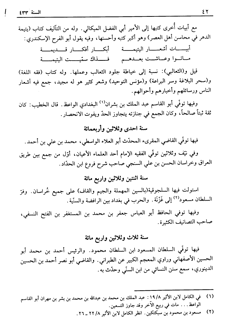 قيل والثعالبي: نسبة إلى خياطة جلود الثعالب وعملها. وله كتاب فقه اللغة وسحر البلاغة وسر البراعة ومؤنس التوحيد وشعر كثير هو له مجيد، جمع فيه أشعار الناس ورسائلهم وأخبارهم وأحوالهم. وفيها توفي أبو القاسم عبد الملك بن بشران البغدادي الواعظ. قال الخطيب: كان ثقة ثبتاً صالحاً، وكان الجمع في جنازته يتجاوز الحد ويفوت الانحصار.