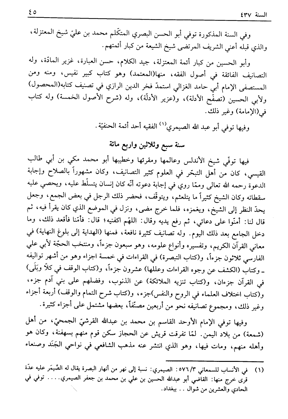 وفي السنة المذكورة توفي أبو الحسن البصري المتكلم محمد بن علي شيخ المعتزلة، والذي قبله أعني الشريف المرتضى شيخ الشيعة من كبار أئمتهم. وأبو الحسين من كبار أئمة المعتزلة، جيد الكلام، حسن العبارة، غزير المادة، وله التصانيف الفائقة في أصول الفقه، منها المعتمد وهو كتاب كبير نفيس، ومنه ومن المستصفى الإمام أبي حامد الغزالي استمد فخر الدين الرازي في تصنيف كتابه المحصول ولأبي الحسين تصفح الأدلة، وعزير الأدلة، وله شرح الأصول الخمسة وله كتاب في الإمامة وغير ذلك. وفيها توفي أبو عبد الله الصيمري الفقيه أحد أئمة الحنفية.