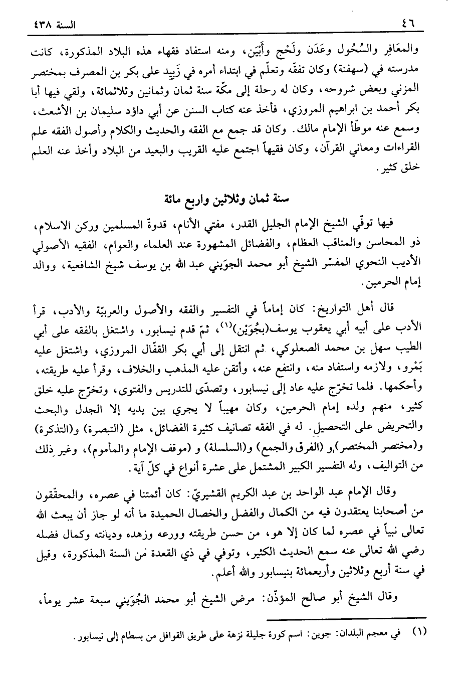فيها توفي الشيخ الإمام الجليل القدر، مفتي الأنام، قدوة المسلمين وركن الاسلام، ذو المحاسن والمناقب العظام، والفضائل المشهورة عند العلماء والعوام، الفقيه الأصولي الأديب النحوي المفسر الشيخ أبو محمد الجويني عبد الله بن يوسف شيخ الشافعية، ووالد إمام الحرمين. قال أهل التواريخ: كان إماماً في التفسير والفقه والأصول والعربية والأدب، قرأ الأدب على أبيه أبي يعقوب يوسف بجوي، ثم قدم نيسابور، واشتغل بالفقه على أبي الطيب سهل بن محمد الصعلوكي، ثم انتقل إلى أبي بكر القفال المروزي، واشتغل عليه بمرر، ولازمه واستفاد منه، وانتفع عنه، وأتقن عليه المذهب والخلاف، وقرأ عليه طريقته، وأحكمها. فلما لخرج عليه عاد إلى نيسابور، وتصدى للتدريس والفتوى، وتخرج عليه خلق كثير، منهم ولده إمام الحرمين، وكان مهيباً لا يجري بين يديه إلا الجدل والبحث والتحريض على التحصيل. له في الفقه تصانيف كثيرة الفضائل، مثل التبصرة والتذكرة ومختصر المختصر والفرق والجمع والسلسلة وموقف الإمام والمأموم، وغير ذلك من التواليف، وله التفسير الكبير المشتمل على عشرة أنواع في كل آية. وقال الإمام عبد الواحد بن عبد الكريم القشيري: كان أئمتنا في عصره، والمحققون من أصحابنا يعتقدون فيه من الكمال والفضل والخصال الحميدة ما أنه لو جاز أن يبعث الله تعالى نبياً في عصره لما كان إلا هو، من حسن طريقته وورعه وزهده وديانته وكمال فضله رضي الله تعالى عنه سمع الحديث الكثير، وتوفي في ذي القعدة من السنة المذكورة، وقيل قي سنة أربع وثلاثين وأربعمائة بنيسابور والله أعلم. وقال الشيخ أبو صالح المؤذن: مرض الشيخ أبو محمد الجوينى سبعة عشر يوماً،