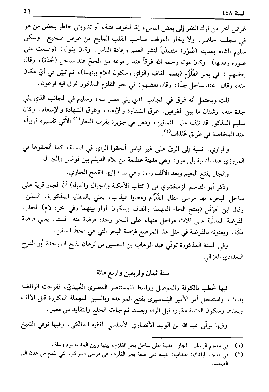 غرض آخر من ترك النظر إلى بعض الناس، إما لخوف فتنة، أو تشويش خاطر ببعض من هو في مجلسه حاضر. ولا يخلو الموقف صاحب القلب المليح من غرض صحيح. وسكن سليم الشام بمدينة صور متصدياً لنشر العلم وإفادة الناس. وكان يقول: وضعت مني صوره رفعتها. وكان موته رحمه الله غرقاً عند رجوعه من الحج عند ساحل جدة، وقال بعضهم: في بحر القلزم بضم القاف والزاي وسكون اللام بينهما، ثم تبئين في أي مكان منه، وقال: عند ساحل جدة، وقال بعضهم: في بحر القلزم المذكور غرق فيه فرعون. قلت ويحتمل أنه غرق في الجانب الذي يلي مصر منه، وسليم في الجانب الذي يلي جدة منه، وشتان ما بين الغرقين: غرق الشقاوة والإبعاد، وغرق الشهادة والإسعاد. وكان سليم المذكور قد نيف على الثمانين، ودفن في جزيرة بقرب الجار الآتي تفسيره قريباً، عند المخاضة في طريق عيذا. والرازي: نسبة إلى الري على غير قياس ألحقوا الزاي في النسبة، كما ألحقوها في المروزي عند النسبة إلى مرو: وهي مدينة عظيمة من بلاد الديلم بين قومس والجبال. والجار بفتح الجيم وبعد الألف راء: وهي بلدة إليها القمح الجاري. وذكر أبو القاسم الزمخشري في كتاب الأمكنة والجبال والمياه أن الجار قرية على ساحل البحر، بها مرسى مطايا القلزم ومطايا عيذاب، يعني بالمطايا المذكورة: السفن. وقال ابن حوقل بفتح الحاء المهملة والقاف وسكون الواو بينهما وفي آخره لام الجار: الفرضة المدلية على ثلاث مراحل منها، على البحر وحده فرضة منه. قلت: يعني فرضة مكة، ويعنونه بالفرضة في مثل هذا الموضع فرضة البحر التي هي محط السفن. وفي السنة المذكورة توفي عبد الوهاب بن الحسين بن برهان بفتح الموحدة أبو الفرح البغدادي الغزالي.