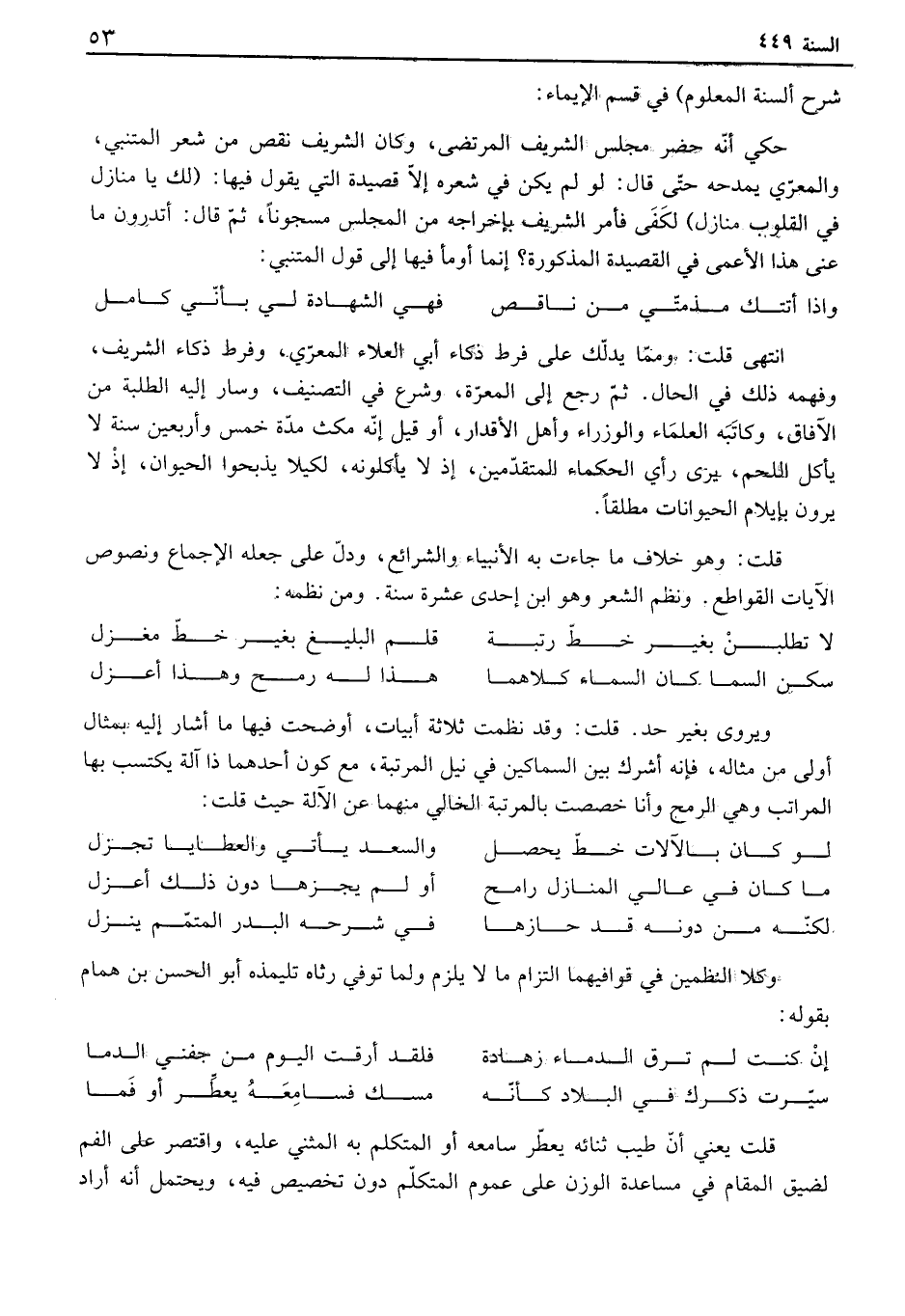 انتهى قلت: ومما يدلك على فرط ذكاء أبي العلاء المعري، وفرط ذكاء الشريف، وفهمه ذلك في الحال. ثم رجع إلى المعرة، وشرع في التصنيف، وسار إليه الطلبة من الآفاق، وكاتبه العلماء والوزراء وأهل الأقدار، أو قيل إنه مكث مدة خمس وأربعين سنة لا يأكل اللحم، يرى رأي الحكماء المتقدمين، إذ لا يأكلونه، لكيلا يذبحوا الحيوان، إذ لا يرون بإيلام الحيوانات مطلقاً. قلت: وهو خلاف ما جاءت به الأنبياء والشرائع، ودل على جعله الإجماع ونصوص الآيات القواطع. ونظم الشعر وهو ابن إحدى عشرة سنة. ومن نظمه: