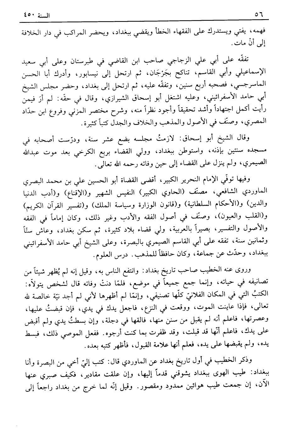 فهمه، يفتي ويستدرك على الفقهاء الخطأ ويقضي ببغداد، ويحضر المراكب في دار الخلاف، إلى أن مات. تفقه على أبي علي الزجاجي صاحب ابن القاضي في طبرستان وعلى أبي سعيد الإسماعيلي وأبي القاسم، تناكح بجرجان، ثم ارتحل إلى نيسابور، وأدرك أبا الحس، الماسرجسي، فصحبه أربع سنين، وتفقه عليه، ثم ارتحل إلى بغداد، وحضر مجلس الشيخ أبي حامد الأسفرائيني، وعليه اشتغل أبو إسحاق الشيرازي، وقال في حقه: لم أر فيمن رأيت أكمل اجتهاداً وأشد تحقيقاً وأجود نظراً منه، وشرح مختصر المزني وفروع ابن حداد المصري، وصنف في الأصول والمذهب والخلاف والجدل كتباً كثيرة. وقال الشيخ أبو إسحاق: لازمت مجلسه بضع عشر سنة، ودرست أصحابه في مسجده سنتين بإذنه، واستوطن ببغداد، وولي القضاء بربع الكرخي بعد موت عبد الله الصيمري، ولم ينزل على القضاء إلى حين وفاته رحمه الله تعالى. وفيها توفي الإمام النحرير الكبير، أقضى القضاة أبو الحسين علي بن محمد البصري الماوردي الشافعي، مصنف الحاوي الكبير النفيس الشهير والإقناع وأدب الدنيا والدين والأحكام السلطانية وقانون الوزارة وسياسة الملك وتفسير القرآن الكريم والقلب والعيون، وصنف في أصول الفقه والأدب وغير ذلك، وكان إماماً في الفقه والأصول والتفسير، بصيراً بالعربية، ولي قضاء بلاد كثيرة، ثم سكن بغداد، وعاش ستاً وثمانين سنة، تفقه على أبي القاسم الصيمري بالبصرة، وعلى الشيخ أبي حامد الأسفرائيني ببغداد، وحدث عن جماعة، وكان حافظاً للمذهب. درس العلوم. وروى عنه الخطيب صاحب تاريخ بغداد: وانتفع الناس به، وقيل إنه لم يظهر شيئاً من تصانيفه في حياته، وإنما جمع جميعاً في موضع، فلما دنت وفاته قال لشخص يتولاه: الكتب التي في المكان الفلاني كلها تصنيفي، وإنما لم أظهرها لأني لم أجد نية خالصة لله تعالى، فإذا عاينت الموت، ووقعت في النزع، فاجعل يدك في يدي، فإن قبضت عليها، وعصرتها، فاعلم أنه لم يقبل من سنن منها، فالقها في دجلة، وإن بسطت يدي ولم أقبض على يدك، فاعلم أنها قد قبلت، وقد ظفرت بما كنت أرجوه. ففعل الموصي ذلك، فبسط يده، ولم يقبضها على يده، فعلم أنها علامة القبول، فأظهر كتبه بعده. وذكر الخطيب في أول تاريخ بغداد عن الماوردي قال: كتب إلي أخي من البصرة وأنا ببغداد: طيب الهوى ببغداد يشوقني قدماً إليها، وإن علقت مقادير، فكيف صبري عنها الآن، إن جمعت طيب هوائين ممدود ومقصور. وقيل إنه لما خرج من بغداد راجعاً إلى