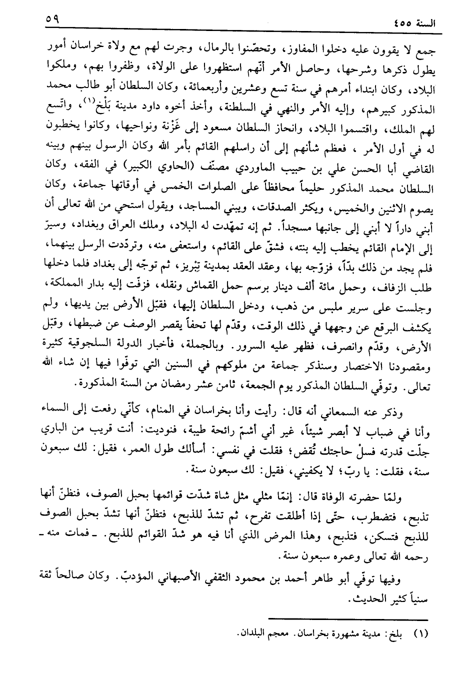 جمع لا يقوون عليه دخلوا المفاوز، وتحضنوا بالرمال، وجرت لهم مع ولاة خراسان أمور يطول ذكرها وشرحها، وحاصل الأمر أنهم استظهروا على الولاة، وظفروا بهم، وملكوا البلاد، وكان ابتداء أمرهم في سنة تسع وعشرين وأربعمائة، وكان السلطان أبو طالب محمد المذكور كبيرهم، وإليه الأمر والنهي في السلطنة، وأخذ أخوه داود مدينة بل، واتسع لهم الملك، واقتسموا البلاد، وانحاز السلطان مسعود إلى غزنة ونواحيها، وكانوا يخطبون له في أول الأمر، فعظم شأنهم إلى أن راسلهم القائم بأمر الله وكان الرسول بينهم وبينه الماضي أبا الحسن علي بن حبيب الماوردي مصنف الحاوي الكبير في الفقه، وكان السلطان محمد المذكور حليماً محافظاً على الصلوات الخمس في أوقاتها جماعة، وكان يصوم الاثنين والخميس، ويكثر الصدقات، ويبني المساجد، ويقول استحي من الله تعالى أن أبني داراً لا أبني إلى جانبها مسجداً. ثم إنه تمهدت له البلاد، وملك العراق وبغداد، وسير إلى الإمام القائم يخطب إليه بنته، فشق على القائم، واستعفى منه، وترددت الرسل بينهما، فلم يجد من ذلك بداً، فزوجه بها، وعقد العقد بمدينة تبريز، ثم توجه إلى بغداد فلما دخلها طلب الزفاف، وحمل مائة ألف دينار برسم حمل القماش ونقله، فزفت إليه بدار المملكة، وجلست على سرير ملبس من ذهب، ودخل السلطان إليها، فقبل الأرض بين يديها، ولم يكشف البرقع عن وجهها في ذلك الوقت، وقدم لها تحفاً يقصر الوصف عن ضبطها، وقبل الأرض، وقدم وانصرف، فظهر عليه السرور. وبالجملة، فأخبار الدولة السلجوقية كثيرة ومقصودنا الاختصار وسنذكر جماعة من ملوكهم في السنين التي توفوا فيها إن شاء الله تعالى. وتوفي السلطان المذكور يوم الجمعة، ثامن عشر رمضان من السنة المذكورة. وذكر عنه السمعاني أنه قال: رأيت وأنا بخراسان في المنام، كأني رفعت إلى السماء وأنا في ضباب لا أبصر شيئاً، غير أني أشم رائحة طيبة، فنوديت: أنت قريب من الباري جلت قدرته فسل حاجتك تقض؛ فقلت في نفسي: أسألك طول العمر، فقيل: لك سبعون سنة، فقلت: يارب؛ لا يكفيني، فقيل: لك سبعون سنة. ولما حضرته الوفاة قال: إنما مثلي مثل شاة شدت قوائمها بحبل الصوف، فنظن أنها تذبح، فتضطرب، حتى إذا أطلقت تفرح، ثم تشد للذبح، فتظن أنها تشد بحبل الصوف للذبح فتسكن، فتذبح، وهذا المرض الذي أنا فيه هو شد القوائم للذبح. - فمات منه - رحمه الله تعالى وعمره سبعون سنة. وفيها توفي أبو طاهر أحمد بن محمود الثقفي الأصبهاني المؤدب. وكان صالحاً ثقة سنياً كثير الحديث.