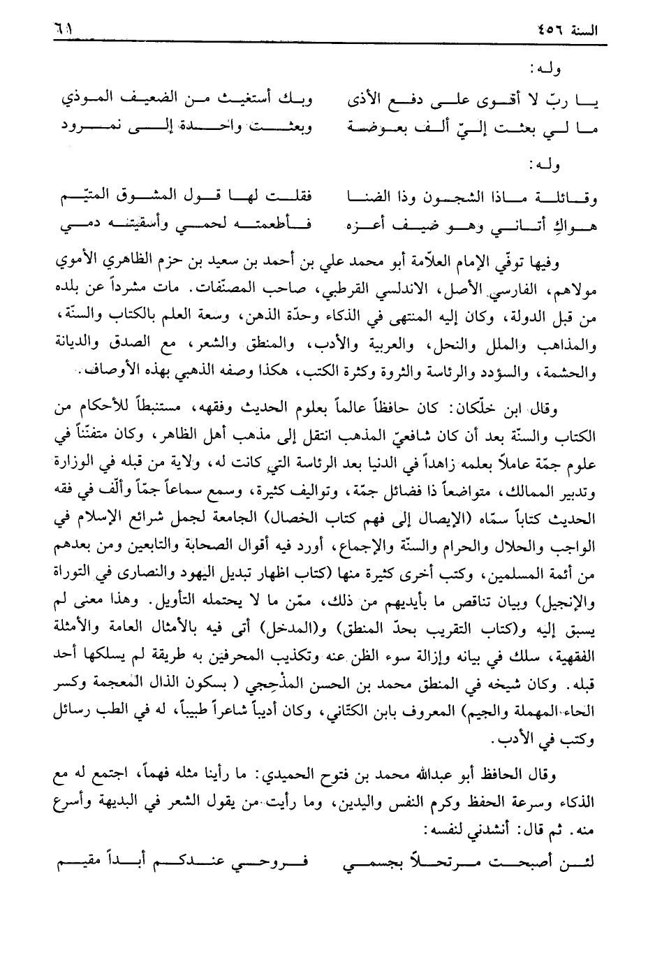 وفيها توفي الإمام العلامة أبو محمد علي بن أحمد بن سعيد بن حزم الظاهري الأموي مولاهم، الفارسي الأصل، الاندلسي القرطبي، صاحب المصنفات. مات مشرداً عن بلده من قبل الدولة، وكان إليه المنتهى في الذكاء وحدة الذهن، وسعة العلم بالكتاب والسنة، والمذاهب والملل والنحل، والعربية والأدب، والمنطق والشعر، مع الصدق والديانة والحشمة، والسؤدد والرئاسة والثروة وكثرة الكتب، هكذا وصفه الذهبي بهذه الأوصاف. وقال ابن خلكان: كان حافظاً عالماً بعلوم الحديث وفقهه، مستنبطاً للأحكام من الكتاب والسنة بعد أن كان شافعي المذهب انتقل إلى مذهب أهل الظاهر، وكان متفنناً في علوم جمة عاملاً بعلمه زاهداً في الدنيا بعد الرئاسة التي كانت له، ولاية من قبله في الوزارة وتدبير الممالك، متواضعاً ذا فضائل جمة، وتواليف كثيرة، وسمع سماعاً جماً وألف في فقه الحديث كتاباً سماه الإيصال إلى فهم كتاب الخصال الجامعة لجمل شرائع الإسلام في الواجب والحلال والحرام والسنة والإجماع، أورد فيه أقوال الصحابة والتابعين ومن بعدهم من أئمة المسلمين، وكتب أخرى كثيرة منها كتاب اظهار تبديل اليهود والنصارى في التوراة والإنجيل وبيان تناقص ما بأيديهم من ذلك، ممن ما لا يحتمله التأويل. وهذا معنى لم يسبق إليه وكتاب التقريب بحد المنطق والمدخل أتى فيه بالأمثال العامة والأمثلة الفقهية، سلك في بيانه وإزالة سوء الظن عنه وتكذيب المحرفين به طريقة لم يسلكها أحد قبله. وكان شيخه في المنطق محمد بن الحسن المذحجي بسكون الذال المعجمة وكسر الحاء المهملة والجيم المعروف بابن الكتاني، وكان أديباً شاعراً طبيباً، له في الطب رسائل وكتب في الأدب. وقال الحافظ أبو عبد الله محمد بن فتوح الحميدي: ما رأينا مثله فهماً، اجتمع له مع الذكاء وسرعة الحفظ وكرم النفس واليدين، وما رأيت من يقول الشعر في البديهة وأسرع منه. ثم قال: أنشدني لنفسه: