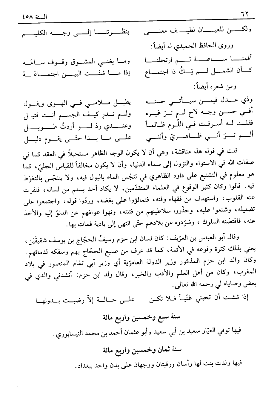 قلت في قوله هذا مناقشة، وهي أن لا يكون الوجه الظاهر مستحيلاً في العقد كما في صفات الله في الاستواء والنزول إلى سماء الدنيا، وأن لا يكون مخالفاً للقياس الجلي، كما هو معلوم في التشنيع على داود الظاهري في تنجس الماء بالبول فيه، ولا يتنجس بالتغوط فيه. قالوا وكان كثير الوقوع في العلماء المتقذمين، لا يكاد أحد يسلم من لسانه، فنفرت عنه القلوب، واستهدف من فقهاء وقته، فتمالؤوا على بغضه، وردوا قوله، واجتمعوا على تضليله، وشنعوا عليه، وحذروا سلاطينهم من فتنته، ونهوا عوامهم عن الدنو إليه والأخذ عنه، فاقتصته الملوك، وشردوه عن بلادهم حتى انتهى إلى بادية فمات بها. وقال أبو العبالس بن العريف: كان لسان ابن حزم وسيف الحجاج بن يوسف شقيقين، يعني بذلك كثرة وقوعه في الأئمة، كما قد عرف من صنيع الحجاج بهم وسفكه لدمائهم. وكان والد ابن حزم المذكور وزير الدولة العامرية أي وزير أبي تمام المنصور في بلاد المغرب، وكان من أهل العلم والأدب والخير، وقال ولد ابن حزم: أنشدني والدي في بعض وصاياه لي رحمه الله تعالى.
