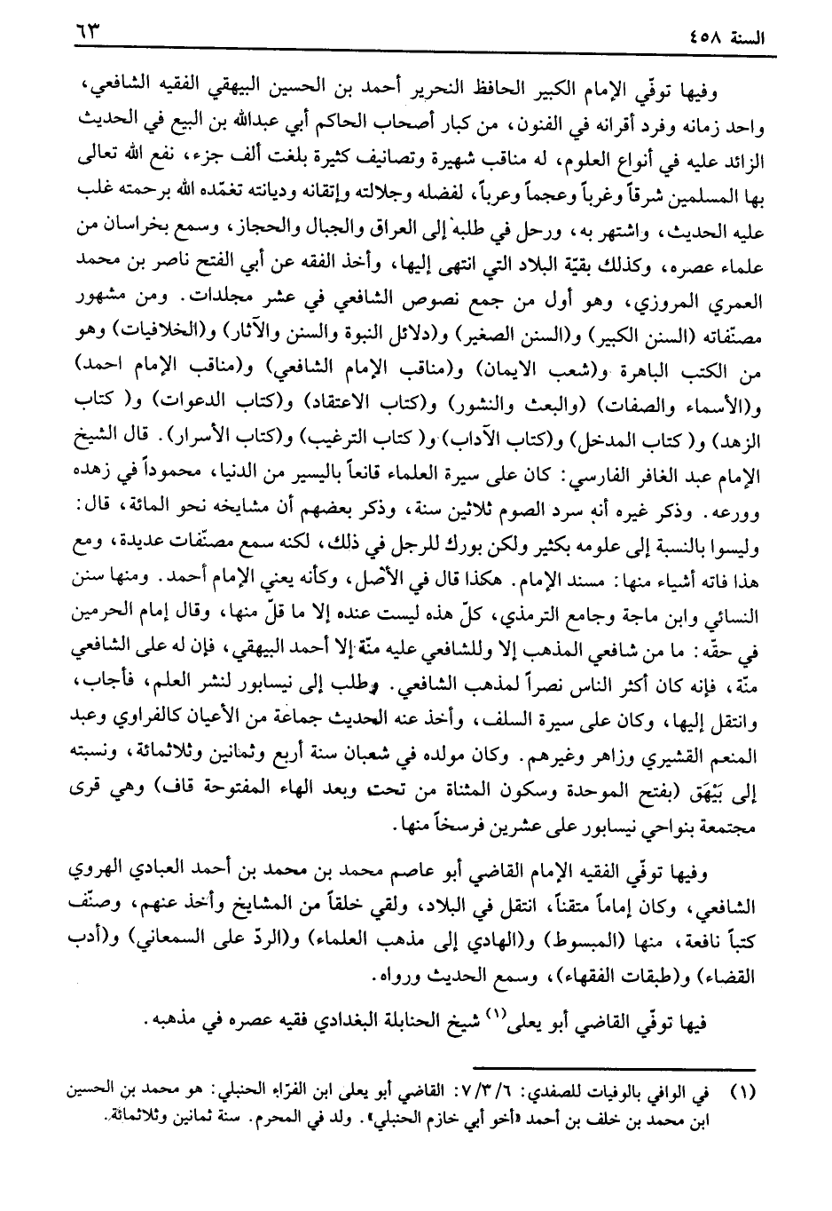 وفيها توفي الإمام الكبير الحافظ النحرير أحمد بن الحسين البيهقي الفقيه الشافعي، واحد زمانه وفرد أقرانه في الفنون، من كبار أصحاب الحاكم أبي عبد الله بن البيع في الحديث الزائد عليه في أنواع العلوم، له مناقب شهيرة وتصانيف كثيرة بلغت ألف جزء، نفع الله تعالى بها المسلمين شرقاً وغرباً وعجماً وعرباً، لفضله وجلالته وإتقانه وديانته تغمده الله برحمته غلب عليه الحديث، واشتهر به، ورحل في طلبه إلى العراق والجبال والحجاز، وسمع بخراسان من علماء عصره، وكذلك بقية البلاد التي انتهى إليها، وأخذ الفقه عن أبي الفتح ناصر بن محمد العمري المروزي، وهو أول من جمع نصوص الشافعي في عشر مجلدات. ومن مشهور مصنفاته السنن الكبير والسنن الصغير ودلائل النبوة والسنن والآثار والخلافيات وهو من الكتب الباهرة وشعب الايمان ومناقب الإمام الشافعي ومناقب الإمام احمد والأسماء والصفات والبعث والنشور وكتاب الاعتقاد وكتاب الدعوات وكتاب الزهد وكتاب المدخل وكتاب الآداب وكتاب الترغيب وكتاب الأسرار. قال الشيخ الإمام عبد الغافر الفارسي: كان على سيرة العلماء قانعاً باليسير من الدنيا، محموداً في زهده وورعه. وذكر غيره أنه سرد الصوم ثلاثين سنة، وذكر بعضهم أن مشايخه نحو المائة، قال وليسوا بالنسبة إلى علومه بكثير ولكن بورك للرجل في ذلك، لكنه سمع مصنفات عديدة، ومع هذا فاته أشياء منها: مسند الإمام. هكذا قال في الأصل، وكأنه يعني الإمام أحمد. ومنها سنن النسائي وابن ماجة وجامع الترمذي، كل هذه ليست عنده إلا ما قل منها، وقال إمام الحرمين في حقه: ما من شافعي المذهب إلا وللشافعي عليه منة إلا أحمد البيهقي، فإن له على الشافعي منة، فإنه كان أكثر الناس نصراً لمذهب الشافعي. وطلب إلى نيسابور لنشر العلم، فأجاب، وانتقل إليها، وكان على سيرة السلف، وأخذ عنه الحديث جماعة من الأعيان كالفراوي وعبد المنعم القشيري وزاهر وغيرهم. وكان مولده في شعبان سنة أربع وثمانين وثلاثمائة، ونسبته إلى بيهق بفتح الموحدة وسكون المثناة من تحت وبعد الهاء المفتوحة قاف وهي قرى مجتمعة بنواحي نيسابور على عشرين فرسخاً منها. وفيها توفي الفقيه الإمام القاضي أبو عاصم محمد بن محمد بن أحمد العبادي الهروي الشافعي، وكان إماماً متقناً، انتقل في البلاد، ولقي خلقاً من المشايخ وأخذ عنهم، وصنف كتباً نافعة، منها المبسوط والهادي إلى مذهب العلماء والرد على السمعاني وأدب القضاء وطبقات الفقهاء، وسمع الحديث ورواه. فيها توفي القاضي أبو يعلى شيخ الحنابلة البغدادي فقيه عصره في مذهبه.