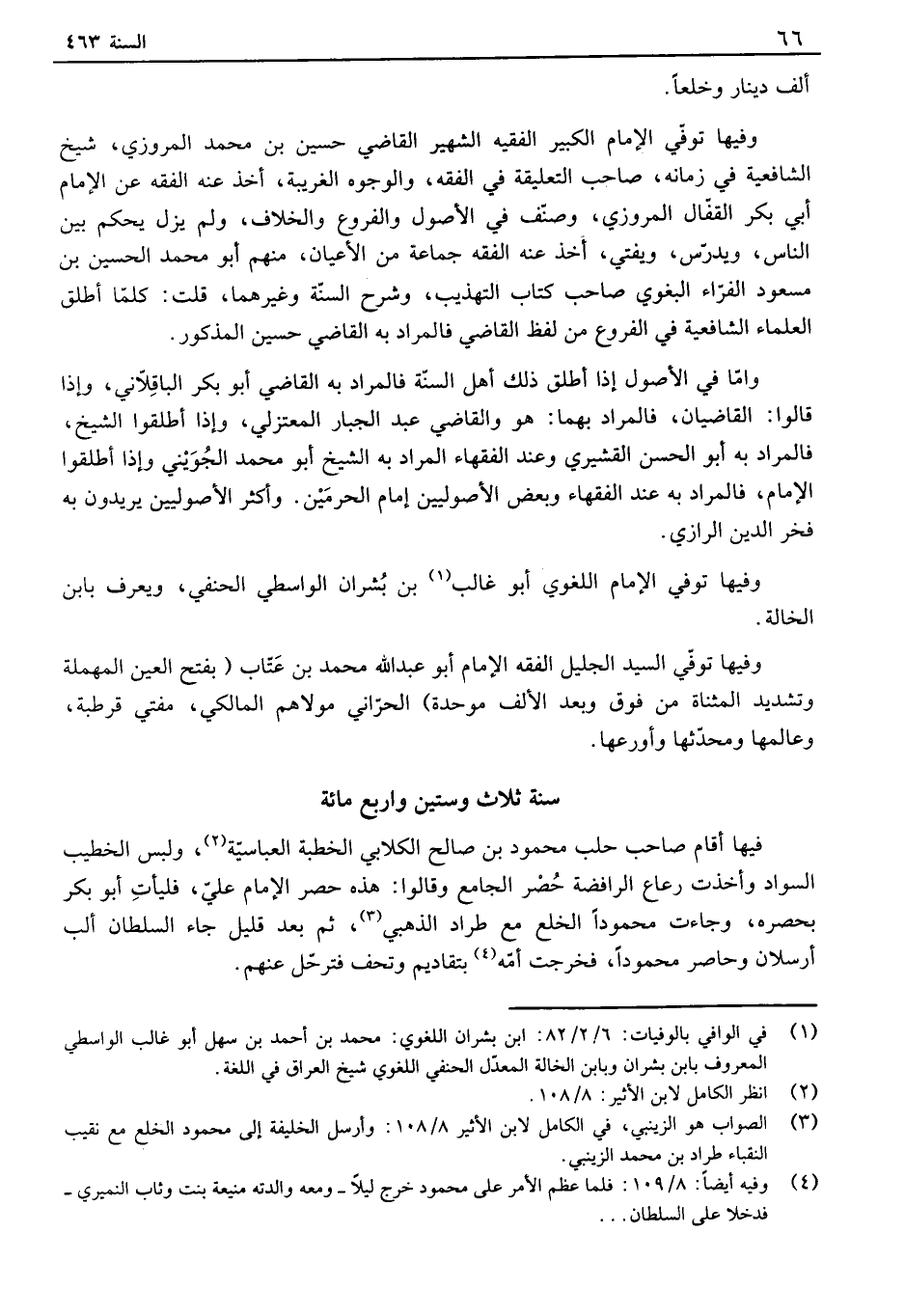 ألف دينار وخلعاً. وفيها توفي الإمام الكبير الفقيه الشهير القاضي حسين بن محمد المروزي، شيخ الشافعية في زمانه، صاحب التعليقة في الفقه، والوجوه الغريبة، أخذ عنه الفقه عن الإمام أبي بكر القفال المروزي، وصنف في الأصول والفروع والخلاف، ولم يزل يحكم بين الناس، ويدرس، ويفتي، أخذ عنه الفقه جماعة من الأعيان، منهم أبو محمد الحسين بن مسعود الفراء البغوي صاحب كتاب التهذيب، وشرح السنة وغيرهما، قلت: كلما أطلق العلماء الشافعية في الفروع من لفظ القاضي فالمراد به القاضي حسين المذكور. واما في الأصول إذا أطلق ذلك أهل السنة فالمراد به القاضي أبو بكر الباقلاني، وإذا قالوا: القاضيان، فالمراد بهما: هو والقاضي عبد الجبار المعتزلي، وإذا أطلقوا الشيخ، فالمراد به أبو الحسن القشيري وعند الفقهاء المراد به الشيخ أبو محمد الجويني وإذا أطلقوا الإمام، فالمراد به عند الفقهاء وبعض الأصوليين إمام الحرمين. وأكثر الأصوليين يريدون به فخر الدين الرازي.