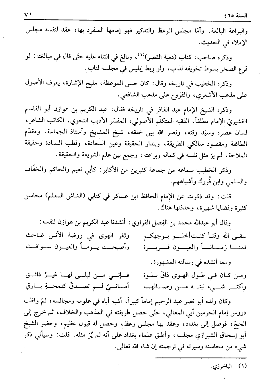 الإمام عبد الغافر في تاريخه فقال: عبد الكريم بن هوازن أبو القاسم القشيري الإمام مطلقاً، الفقيه المتكلم الأصولي، المفسر الأديب النحوي، الكاتب الشاعر، لسان عصره وسيد وقته، ونصر الله بين خلقه، شيخ المشايخ وأستاذ الجماعة، ومقذم الطائفة ومقصود سالكي الطريقة، وبندار الحقيقة وعين السعادة، وقطب السيادة وحقيقة الملاحة، لم ير مثل نفسه في كماله وبراعته، وجمع بين علم الشريعة والحقيقة. وذكر الخطيب سماعه من جماعة كثيرين من الأكابر: كأبي نعيم والحاكم والخفاف والسلمي وابن فورك وأشباههم. قلت: وقد ذكرت عن الإمام الحافظ ابن عساكر في كتابي الشاش المعلم محاسن كثيرة وقضايا شهيرة، وحذفتها هناك. وقال أبو عبد الله محمد بن الفضل الفراوي: أنشدنا عبد الكريم بن هوازن لنفسه: لإمام عبد الغافر في تاريخه فقال: عبد الكريم بن هوازن أبو القاسم القشيري الإمام مطلقاً، الفقيه المتكلم الأصولي، المفسر الأديب النحوي، الكاتب الشاعر، لسان عصره وسيد وقته، ونصر الله بين خلقه، شيخ المشايخ وأستاذ الجماعة، ومقذم الطائفة ومقصود سالكي الطريقة، وبندار الحقيقة وعين السعادة، وقطب السيادة وحقيقة الملاحة، لم ير مثل نفسه في كماله وبراعته، وجمع بين علم الشريعة والحقيقة. وذكر الخطيب سماعه من جماعة كثيرين من الأكابر: كأبي نعيم والحاكم والخفاف والسلمي وابن فورك وأشباههم. قلت: وقد ذكرت عن الإمام الحافظ ابن عساكر في كتابي الشاش المعلم محاسن كثيرة وقضايا شهيرة، وحذفتها هناك. وقال أبو عبد الله محمد بن الفضل الفراوي: أنشدنا عبد الكريم بن هوازن لنفسه: