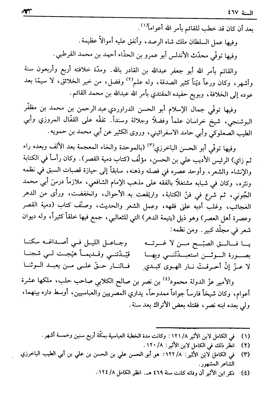 وفيها توفي محدث الأندلس أبو عمرو بن الحذاء أحمد بن محمد القرطبي. والقائم بأمر الله أبو جعفر عبد الله بن القادر بالله. ومدة خلافته أربع وأربعون سنة وأشهر، وكان ورعاً ديناً كثير الصدقة، وله علم وفضل، من خير الخلائق، لا سيما بعد عوده إلى الخلافة، وبويع حفيده المقتدي بأمر الله عبد الله بن محمد القائم. وفيها توفي جمال الإسلام أبو الحسن الدراوردي عبد الرحمن بن محمد بن مظفر البوشنجي، شيخ خراسان علماً وفضلاً وجلالة وسنداً. تفقه على القفال المروزي وأبي الطيب الصعلوكي وأبي حامد الاسفرائيني، وروى الكثير عن أبي محمد بن حمويه. وفيها توفي أبو الحسن الباخرزي بالموحدة والخاء المعجمة بعد الألف وبعده راء ثم زاي الرئيس الأديب علي بن الحسن، مؤلف كتاب دمية القصر. وكان رأساً في الكتابة والإنشاء والشعر، وأوحد عصره في فصله وذهنه، سابقاً إلى حيازة قصبات السبق في نظمه ونثره، وكان في شبابه مشتغلاً بالفقه على مذهب الإمام الشافعي، ملازماً درس أبي محمد الجوني، ثم شرع في فن الكتابة، وارتفعت به الأحوال، وانخفضت، ورأى من الدهر العجائب، وغلب أدبه على فقهه، وعمل الشعر والحديث، وصنف كتاب دمية القصر وعصرة أهل العصر وهو ذيل يتيمة الدهر التي للثعالبي، جمع فيها خلقاً كثيراً، وله ديوان شعر في مجلد كبير. ومن نظمه:
