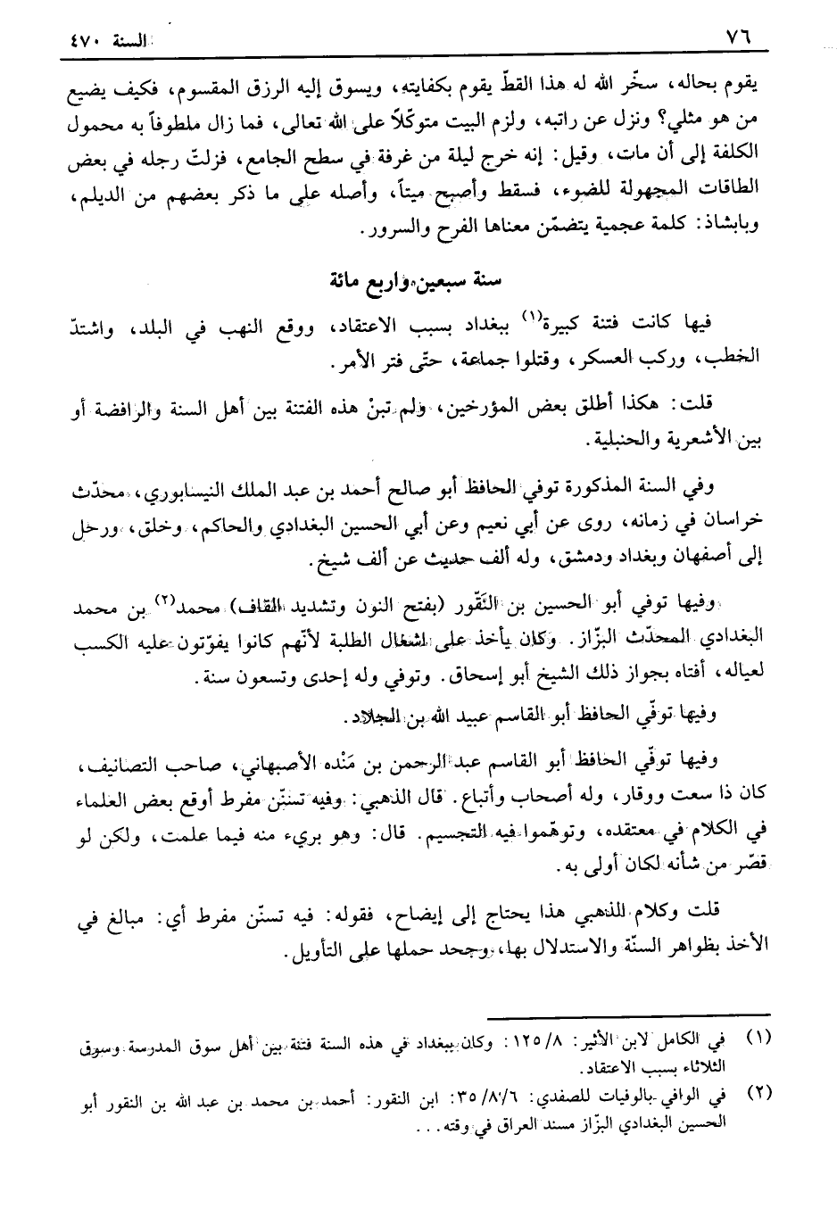 فيها كانت فتنة كبيرة ببغداد بسبب الاعتقاد، ووقع النهب في البلد، وأشتد الخطب، وركب العسكر، وقتلوا جماعة، حتى فتر الأمر. قلت: هكذا أطلق بعض المؤرخين، ولم تبن هذه الفتنة بين أهل السنة والرافضة أو بين الأشعرية والحنبلية. وفي السنة المذكورة توفي الحافظ أبو صالح أحمد بن عبد الملك النيسابوري، محدث خراسان في زمانه، روى عن أبي نعيم وعن أبي الحسين البغدادي وللحاكم، وخلق، ورحل إلى أصفهان وبغداد ودمشق، وله ألف حديث عن ألف شيخ. وفيها توفي أبو الحسين بن النقور بفتح النون وتشديد القاف محمد بن محمد البغدادي المحدث البزاز. وكان يأخذ على اشغال الطلبة لأنهم كانوا يفوتون عليه الكسب لعياله، أفتاه بجواز ذلك الشيخ إبو إسحاق. وتوفي وله إحدى وتسعون سنة. وفيها توفي الحافظ أبو القاسم عبيد الله بن الجلاد. وفيها توفي الحافظ أبو القاسم عبد الرحمن بن منده الأصبهاني، صاحب التصانيف، كان ذا سعت ووقار، وله أصحاب وأتباع. قال الذهبي: وفيه تسنن مفرط أوقع بعض العلماء في الكلام في معتقده، وتوهموا فيه التجسيم. قال: وهو بريء منه فيما علمت، ولكن لو قصر من شأنه لكان أولى به. قلت وكلام الذهبي هذا يحتاج إلى إيضاح، فقوله: فيه تسنن مفرط أي: مبالغ في الأخذ بظواهر السنة والاستدلال بها، وجحد حملها على التأويل.