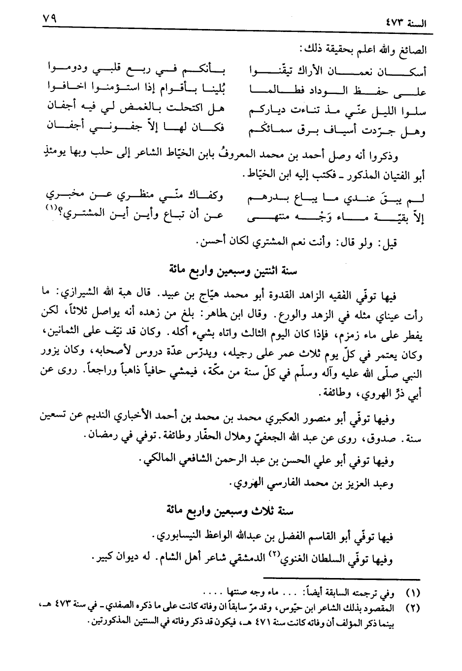 فيها توفي الفقيه الزاهد القدوة أبو محمد هياج بن عبيد. قال هبة الله الشيرازي: ما رأت عيناي مثله في الزهد والورع. وقال ابن طاهر: بلغ من زهده أنه يواصل ثلاثاً، لكن يفطر على ماء زمزم، فإذا كان اليوم الثالث واتاه بشيء أكله. وكان قد نيف على الثمانين، وكان يعتمر في كل يوم ثلاث عمر على رجيله، ويدرس عدة دروس لأصحابه، وكان يزور النبي صلى الله عليه وآله وسلم في كل سنة من مكة، فيمشي حافياً ذاهباً وراجعاً. روى عن أبي ذر الهروي، وطائفة. وفيها توفي أبو منصور العكبري محمد بن محمد بن أحمد الأخباري النديم عن تسعين سنة. صدوق، روى عن عبد الله الجعفي وهلال الحفار وطائفة. توفي في رمضان. وفيها توفي أبو علي الحسن بن عبد الرحمن الشافعي المالكي. وعبد العزيز بن محمد الفارسي الهروي.