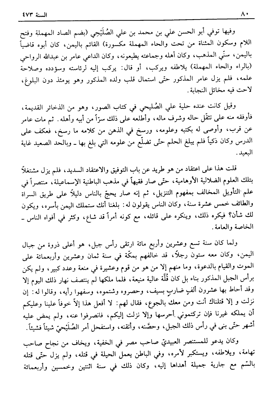 وفيها توفي أبو الحسن علي بن محمد بن علي الصليحي بضم الصاد المهملة وفتح اللام وسكون المثناة من تحت والحاء المهملة مكسورة القائم باليمن، كان أبوه قاضياً باليمن، سني المذهب، وكان أهله وجماعته يطيعونه، وكان الداعي عامر بن عبد الله الرواحي بالراء والحاء المهملة يلاطفه ويركب، أو قال: يركب إليه لرئاسته وسؤدده وصلاحة علمه، فلم يزل عامر المذكور حتى استمال قلب ولده المذكور وهو يومئذ دون البلوغ، لاحت فيه مخائل النجابة. وقيل كانت عنده حلية علي الصليحي في كتاب الصور، وهو من الذخائر القديمة، فأوفقه منه على تثقل حاله وشرف ماله، وأطلعه على ذلك سراً من أبيه وأهله. ثم مات عامر عن قرب، وأوصى له بكتبه وعلومه، ورسخ في الذهن من كلامه ما رسخ، فعكف على الدرس وكان ذكياً فلم يبلغ الحلم حتى تضلع من علومه التي بلغ بها - وبالحد الصعيد غاية البعيد. قلت هذا على اعتقاد من هو طريد عن باب التوفيق والاعتقاد السديد، فلم يزل مشتغلاً بتلك العفوم الضلالية الأوهامية، حتى صار فقيهاً في مذهب الباطنية الإسماعيلة، منتصراً في علم التأويل المخالف بمفهوم التنزيل، ثم إنه صار يحج بالناس دليلاً على طريق السراة والطائف خمس عشرة سنة، وكان الناس يقولون له: بلغنا أنك ستملك اليمن بأسره، ويكون لك شأن؟ فيكره ذلك، وينكره على قائله، مع كونه أمراً قد شاع، وكثر في أفواه الناس - الخاصة والعامة. ولما كان سنة تسع وعشرين رأربع مائة ارتقى رأس جبل، هو أعلى ذروة من جبال اليمن، وكان معه ستون رجلاً، قد خالفهم بمكة في سنة ثمان وعشرين وأربعمائة على الموت والقيام بالدعوة، وما منهم إلا من هو من قوم وعشيرة في منعة وعدد كبير، ولم يكن برأس الجبل المذكور بناء بل كان قلة عالية منيعة، فلما ملكها لم ينتصف نهار ذلك اليوم إلا وقد أحاط بها عشرون ألف ضارب بسيف، وحصروه وشتموه، وسفهوا رأيه، وقالوا له: إن نزلت وإلا قتلناك أنت ومن معك بالجوع، فقال لهم: لا أفعل هذا إلا خوفاً علينا وعليكم أن يملكه غيرنا فإن تركتموني أحرسها وإلا نزلت إليكم، فانصرفوا عنه، ولم يمض عليه أشهر حتى بنى في رأس ذلك الجبل، وحصنه، وأتقنه، واستفحل أمر الصليحي شيئاً فشيئاً. وكان يدعو للمستنصر العبيدي صاحب مصر في الخفية، ويخاف من نجاح صاحب تهامة، ويلاطفه، ويستكبر لأمره، وفي الباطن يعمل الحيلة في قتله، ولم يزل حتى قتله بالسم مع جارية جميلة أهداها إليه، وكان ذلك في سنة اثنتين وخمسين وأربعمائة
