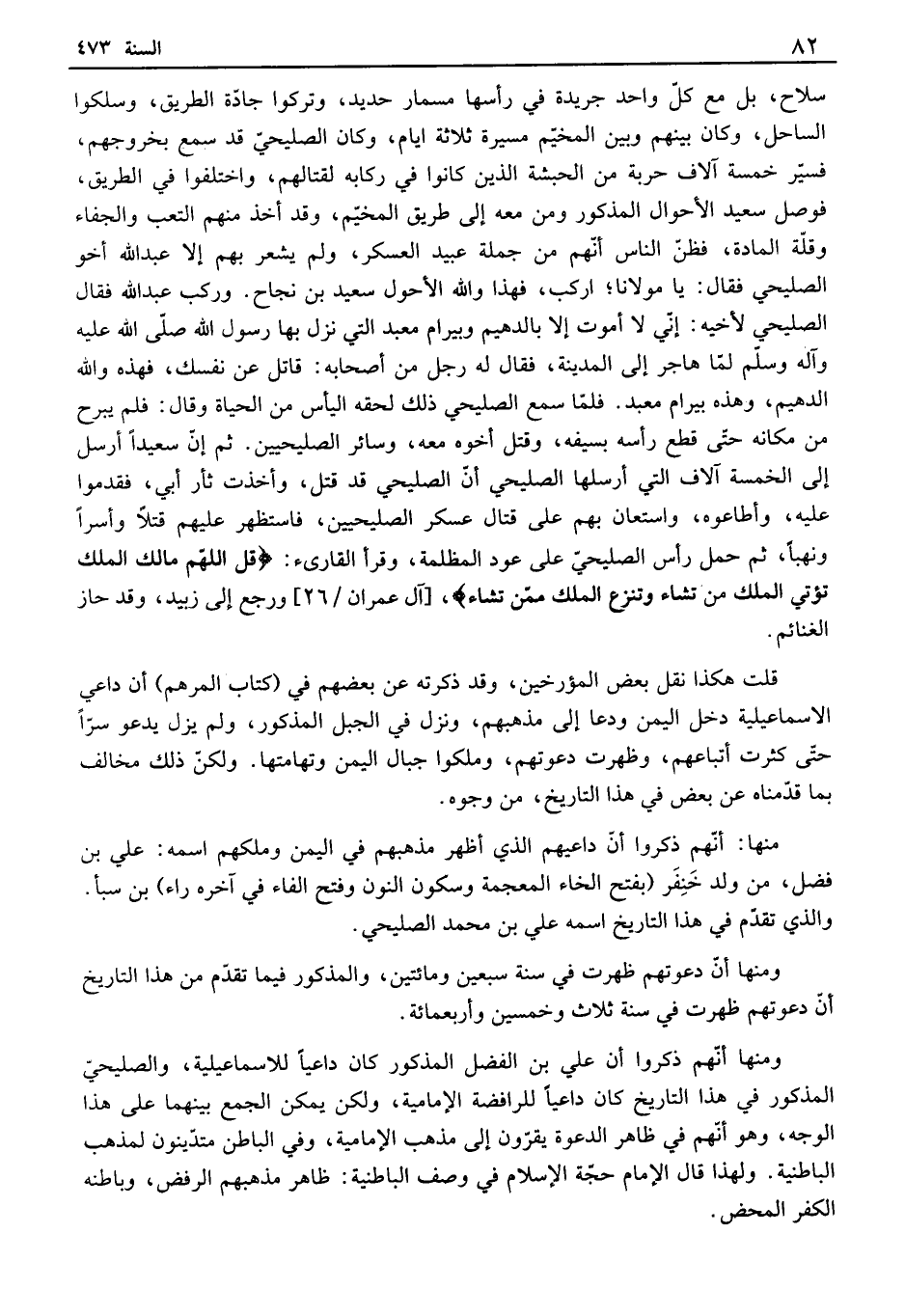 سلاح، بل مع كل واحد جريدة في رأسها مسمار حديد، وتركوا جادة الطريق، وسلكوا الساحل، وكان بينهم وبين المخيم مسيرة ثلاثة ايام، وكان الصليحي قد سمع بخروجهم، فسير خمسة آلاف حربة من الحبشة الذين كانوا في ركابه لقتالهم، واختلفوا في الطريق، فوصل سعيد الأحوال المذكور ومن معه إلى طريق المخيم، وقد أخذ منهم التعب والجفاء وقلة المادة، فظن الناس أنهم من جملة عبيد العسكر، ولم يشعر بهم إلا عبد الله أخو الصليحي فقال: يا مولانا؛ اركب، فهذا والله الأحول سعيد بن نجاح. وركب عبد الله فقال الصليحي لأخيه: إني لا أموت إلا بالدهيم وبيرام معبد التي نزل بها رسول الله صلى الله عليه اله وسلم لما هاجر إلى المدينة، فقال له رجل من أصحابه: قاتل عن نفسك، فهذه والله الدهيم، وهذه بيرام معبد. فلما سمع الصليحي ذلك لحقه اليأس من الحياة وقال: فلم يبرح من مكانه حتى قطع رأسه بسيفه، وقتل أخوه معه، وسائر الصليحيين. ثم إن سعيداً أرسل إلى الخمسة آلاف التي أرسلها الصليحي أن الصليحي قد قتل، وأخذت ثأر أبي، فقدموا عليه، وأطاعوه، واستعان بهم على قتال عسكر الصليحيين، فاستظهر عليهم قتلاً وأسراً ونهباً، ثم حمل رأس الصليحي على عود المظلمة، وقرأ القارىء: " قل اللهم مالك الملك تؤتي الملك من تشاء وتنزع الملك ممن تشاء "، - آل عمران 26 - ورجع إلى زبيد، وقد حاز الغنائم. قلت هكذا نقل بعض المؤرخين، وقد ذكرته عن بعضهم في كتاب المرهم أن داعي الاسماعيلية دخل اليمن ودعا إلى مذهبهم، ونزل في الجبل المذكور، ولم يزل يدعو سراً حتى كثرت أتباعهم، وظهرت دعوتهم، وملكوا جبال اليمن وتهامتها. ولكن ذلك مخالف بما قدمناه عن بعض في هذا التاريخ، من وجوه. منها: أنهم ذكروا أن داعيهم الذي أظهر مذهبهم في اليمن وملكهم اسمه: علي بن فضل، من ولد خنفر بفتح الخاء المعجمة وسكون النون وفتح الفاء في آخره راء بن سبأ. والذي تقدم في هذا التاريخ اسمه علي بن محمد الصليحي. ومنها أن دعوتهم ظهرت في سنة سبعين ومائتين، والمذكور فيما تقدم من هذا التاريخ أن دعوتهم ظهرت في سنة ثلاث وخمسين وأربعمائة.