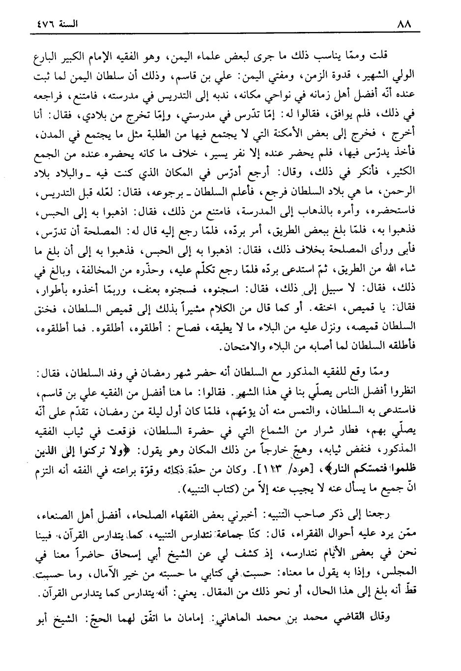 قلت ومما يناسب ذلك ما جرى لبعض علماء اليمن، وهو الفقيه الإمام الكبير البارع الولي الشهير، قدوة الزمن، ومفتي اليمن: علي بن قاسم، وذلك أن سلطان اليمن لما ثبت عنده أنه أفضل أهل زمانه في نواحي مكانه، ندبه إلى التدريس في مدرسته، فامتنع، فراجعه في ذلك، فلم يوافق، فقالوا له: إما تدرس في مدرستي، وإما تخرج من بلادي، فقال: أنا أخرج، فخرج إلى بعض الأمكنة التي لا يجتمع فيها من الطلبة مثل ما يجتمع في المدن، فأخذ يدرس فيها، فلم يحضر عنده إلا نفر يسير، خلاف ما كانه يحضره عنده من الجمع الكثير، فأنكر في ذلك، وقال: أرجع أدرس في المكان الذي كنت فيه - والبلاد بلاد الرحمن، ما هي بلاد السلطان فرجع، فأعلم السلطان - برجوعه، فقال: لعله قبل التدريس، فاستحضره، وأمره بالذهاب إلى المدرسة، فامتنع من ذلك، فقال: اذهبوا به إلى الحبس، فذهبوا به، فلما بلغ ببعض الطريق، أمر برده، فلما رجع إليه قال له: المصلحة أن تدرس، فأبى ورأى المصلحة بخلاف ذلك، فقال: اذهبوا به إلى الحبس، فذهبوا به إلى أن بلغ ما شاء الله من الطريق، ثم استدعى برده فلما رجع تكلم عليه، وحذره من المخالفة، وبالغ في ذلك، فقال: لا سبيل إلى ذلك، فقال: اسجنوه، فسجنوه بعنف، وربما أخذوه بأطوار، فقال: يا قميص، اخنقه. أو كما قال من الكلام مشيراً بذلك إلى قميص السلطان، فخنق السلطان قميصه، ونزل عليه من البلاء ما لا يطيقه، فصاح: أطلقوه، أطلقوه. فما أطلقوه، فأطلقه السلطان لما أصابه من البلاء والامتحان. ومما وقع للفقيه المذكور مع السلطان أنه حضر شهر رمضان في وفد السلطان، فقال: انظروا أفضل الناس يصلي بنا في هذا الشهر. فقالوا: ما هنا أفضل من الفقيه علي بن قاسم، فاستدعى به السلطان، والتمس منه أن يؤمهم، فلما كان أول ليلة من رمضان، تقذم على أنه يصلي بهم، فطار شرار من الشماع التي في حضرة السلطان، فوقعت في ثياب الفقيه المذكور، فنفض ثيابه، وهج خارجاً من ذلك المكان وهو يقول: " ولا تركنوا إلى الذين ظلموا فتمسكم النار "، - هود 113 -. وكان من حدة ذكائه وقوة براعته في الفقه أنه التزم ان جميع ما يسأل عنه لا يجيب عنه إلا من كتاب التنبيه. رجعنا إلى ذكر صاحب التنبيه: