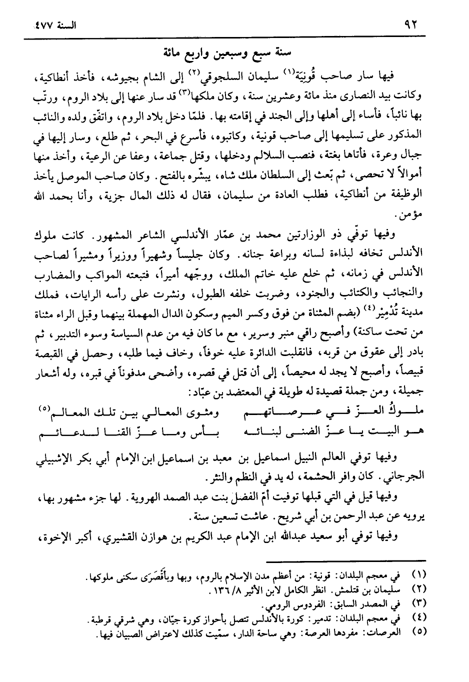 وفيها توفي ذو الوزارتين محمد بن عمار الأندلسي الشاعر المشهور. كانت ملوك الأندلس تخافه لبذاءة لسانه وبراعة جنانه. وكان جليساً وشهيراً ووزيراً ومشيراً لصاحب الأندلس في زمانه، ثم خلع عليه خاتم الملك، ووجهه أميراً، فتبعته المواكب والمضارب والنجائب والكتائب والجنود، وضربت خلفه الطبول، ونشرت على رأسه الرايات، فملك مدينة تدمير بضم المثناة من فوق وكسر الميم وسكون الدال المهملة بينهما وقبل الراء مثناة من تحت ساكنة وأصبح راقي منبر وسرير، مع ما كان فيه من عدم السياسة وسوء التدبير، ثم بادر إلى عقوق من قربه، فانقلبت الدائرة عليه خوفاً، وخاف فيما طلبه، وحصل في القبصة قبيصاً، وأصبح لا يجد له محيصاً، إلى أن قتل في قصره، وأضحى مدفوناً في قبره، وله أشعار جميلة، ومن جملة قصيدة له طويلة في المعتضد بن عباد: