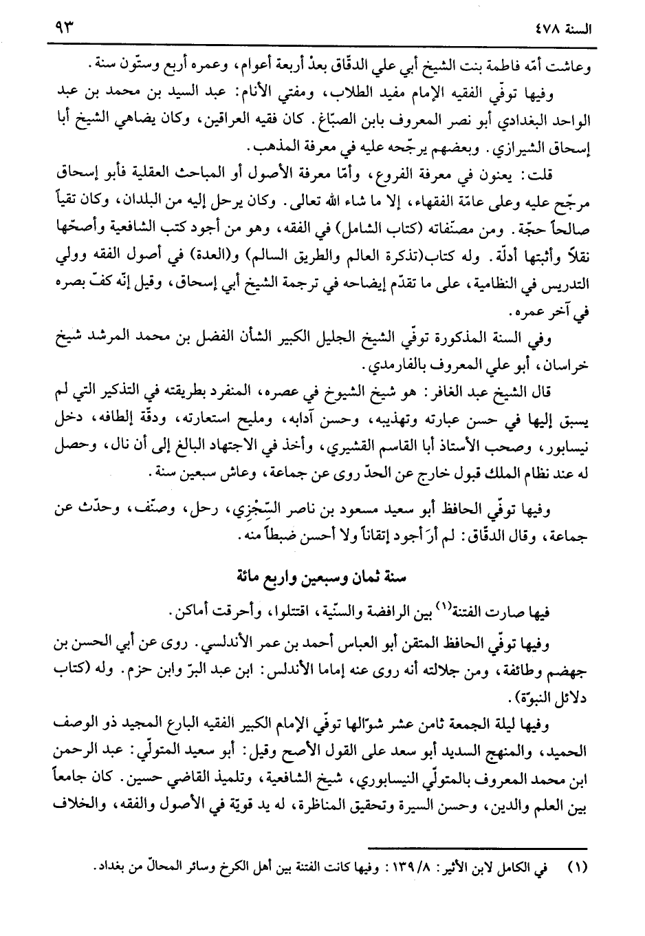 فيها صارت الفتنة بين الرافضة والسنية، اقتتلوا، وأحرقت أماكن. وفيها توفي الحافظ المتقن أبو العباس أحمد بن عمر الأندلسي. روى عن أبي الحسن بن جهضم وطائفة، ومن جلالته أنه روى عنه إماما الأندلس: ابن عبد البز وابن حزم. وله كتاب دلائل النبوة. وفيها ليلة الجمعة ثامن عشر شوالها توفي الإمام الكبير الفقيه البارع المجيد ذو الوصف الحميد، والمنهج السديد أبو سعد على القول الأصح وقيل: أبو سعيد المتولي: عبد الرحمن ابن محمد المعروف بالمتولي النيسابوري، شيخ الشافعية، وتلميذ القاضي حسين. كان جامعاً بين العلم والدين، وحسن السيرة وتحقيق المناظرة، له يد قوية في الأصول والفقه، والخلاف