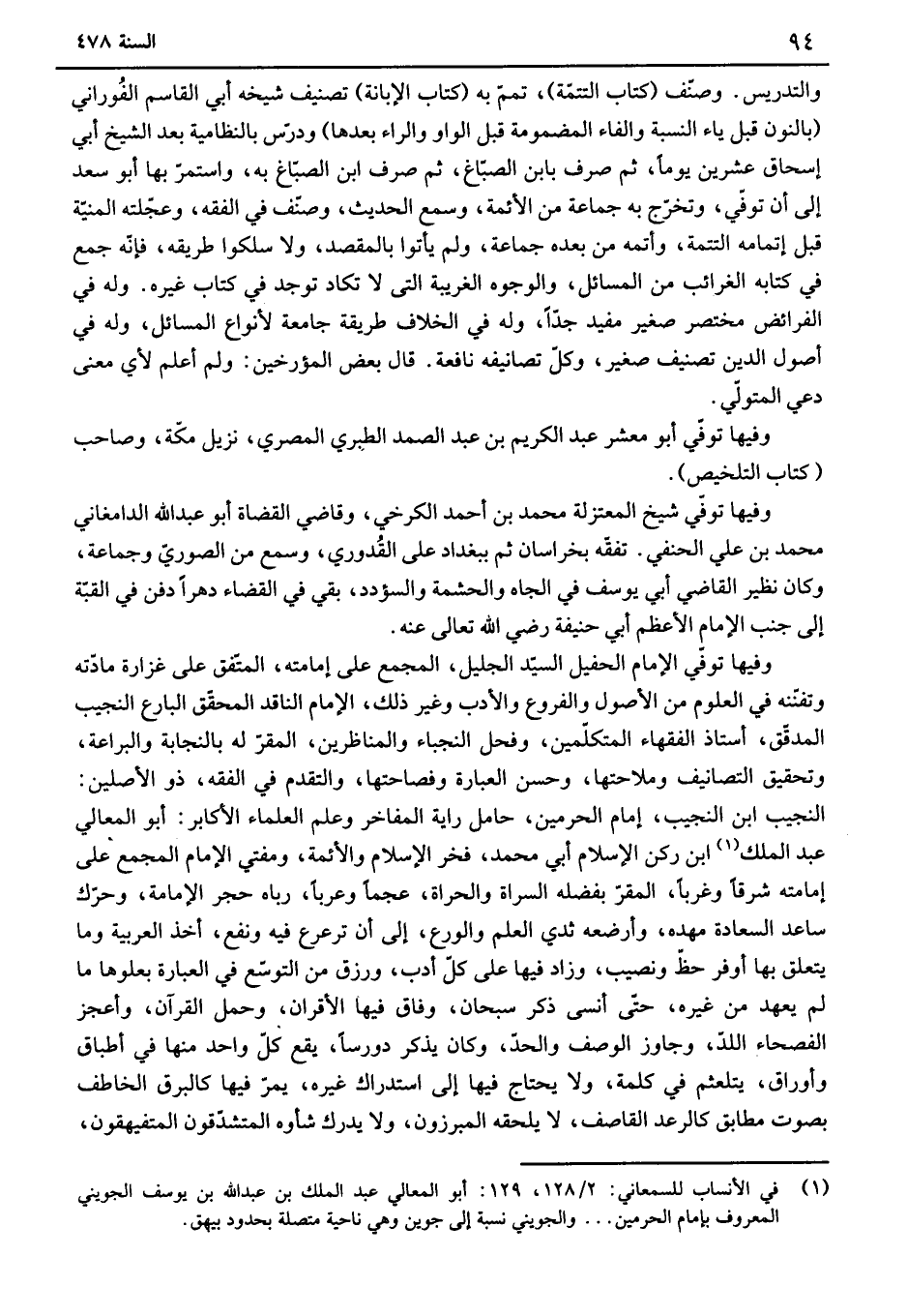 والتدريس. وصنف كتاب التتمة، تمم به كتاب الإبانة تصنيف شيخه أبي القاسم الفوراني بالنون قبل ياء النسبة والفاء المضمومة قبل الواو والراء بعدها ودرس بالنظامية بعد الشيخ أبي إسحاق عشرين يوماً، ثم صرف بابن الصباغ، ثم صرف ابن الصباغ به، واستمر بها أبو سعد إلى أن توفي، وتخرج به جماعة من الأئمة، وسمع الحديث، وصنف في الفقه، وعجلته المنية قبل إتمامه التتمة، وأتمه من بعده جماعة، ولم يأتوا بالمقصد، ولا سلكوا طريقه، فإنه جمع في كتابه الغرائب من المسائل، والوجوه الغريبة التى لا تكاد توجد في كتاب غيره. وله في الفرائض مختصر صغير مفيد جداً، وله في الخلاف طريقة جامعة لأنواع المسائل، وله في أصول الدين تصنيف صغير، وكل تصانيفه نافعة. قال بعض المؤرخين: ولم أعلم لأي معنى دعي المتولي. وفيها توفي أبو معشر عبد الكريم بن عبد الصمد الطبري المصري، نزيل مكة، وصاحب كتاب التلخيص. وفيها توفي شيخ المعتزلة محمد بن أحمد الكرخي، وقاضي القضاة أبو عبد الله الدامغاني محمد بن علي الحنفي. تفقه بخراسان ثم ببغداد على القدوري، وسمع من الصوري وجماعة، وكان نظير القاضي أبي يوسف في الجاه والحشمة والسؤدد، بقي في القضاء دهراً دفن في القبة إلى جنب الإمام الأعظم أبي حنيفة رضي الله تعالى عنه. وفيها توفي الإمام الحفيل السيد الجليل، المجمع على إمامته، المتفق على غزارة مادته وتفننه في العلوم من الأصول والفروع والأدب وغير ذلك، الإمام الناقد المحقق البارع النجيب المدقق، أستاذ الفقهاء المتكلمين، وفحل النجباء والمناظرين، المقر له بالنجابة والبراعة، وتحقيق التصانيف وملاحتها، وحسن العبارة وفصاحتها، والتقدم في الفقه، ذو الأصلين: النجيب ابن النجيب، إمام الحرمين، حامل راية المفاخر وعلم العلماء الأكابر: أبو المعالي عبد الملك ابن ركن الإسلام أبي محمد، فخر الإسلام والأئمة، ومفتي الإمام المجمع على إمامته شرقاً وغرباً، المقر بفضله السراة والحراة، عجماً وعرباً، رباه حجر الإمامة، وحرك ساعد السعادة مهده، وأرضعه ثدي العلم والورع، إلى أن ترعرع فيه ونفع، أخذ العربية وما يتعلق بها أوفر حظ ونصيب، وزاد فيها على كل أدب، ورزق من التوسع في العبارة بعلوها ما لم يعهد من غيره، حتى أنسى ذكر سبحان، وفاق فيها الأقران، وحمل القرآن، وأعجز الفصحاء اللد، وجاوز الوصف والحد، وكان يذكر دروساً، يقع كل واحد منها في أطباق وأوراق، يتلعثم في كلمة، ولا يحتاج فيها إلى استدراك غيره، يمر فيها كالبرق الخاطف بصوت مطابق كالرعد القاصف، لا يلحقه المبرزون، ولا يدرك شأوه المتشدقون المتفيهقون،