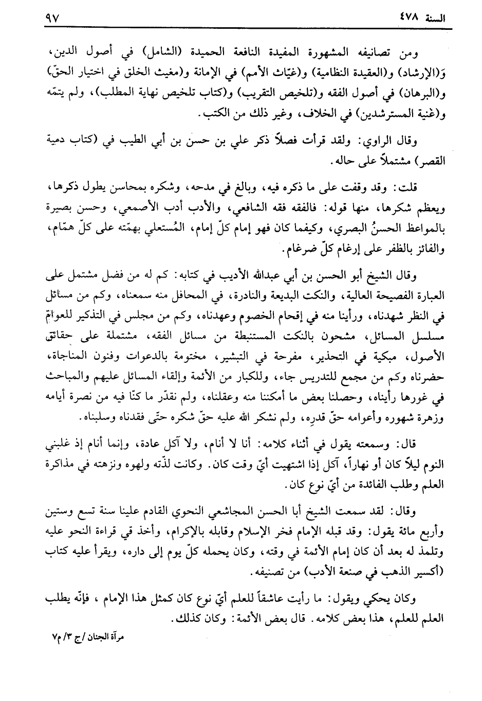القصر مشتملاً على حاله. قلت: وقد وقفت على ما ذكره فيه، وبالغ في مدحه، وشكره بمحاسن يطول ذكرها، ويعظم شكرها، منها قوله: فالفقه فقه الشافعي، والأدب أدب الأصمعي، وحسن بصيرة بالمواعظ الحسن البصري، وكيفما كان فهو إمام كل إمام، المستعلي بهمته على كل همام، والفائز بالظفر على إرغام كل ضرغام. وقال الشيخ أبو الحسن بن أبي عبد الله الأديب في كتابه: كم له من فضل مشتمل على العبارة الفصيحة العالية، والنكت البديعة والنادرة، في المحافل منه سمعناه، وكم من مسائل في النظر شهدناه، ورأينا منه في إقحام الخصوم وعهدناه، وكم من مجلس في التذكير للعوام مسلسل المسائل، مشحون بالنكت المستنبطة من مسائل الفقه، مشتملة على حقائق الأصول، مبكية في التحذير، مفرحة في التبشير، مختومة بالدعوات وفنون المناجاة، حضرناه وكم من مجمع للتدريس جاء، وللكبار من الأئمة وإلقاء المسائل عليهم والمباحث في غورها رأيناه، وحصلنا بعض ما أمكننا منه وعقلناه، ولم نقدر ما كنا فيه من نصرة أيامه وزهرة شهوره وأعوامه حق قدره، ولم نشكر الله عليه حق شكره حتى فقدناه وسلبناه. قال: وسمعته يقول في أثناء كلامه: أنا لا أنام، ولا آكل عادة، وإنما أنام إذ غلبني النوم ليلاً كان أو نهاراً، آكل إذا اشتهيت أي وقت كان. وكانت لذته ولهوه ونزهته في مذاكرة العلم وطلب الفائدة من أي نوع كان. وقال: لقد سمعت الشيخ أبا الحسن المجاشعي النحوي القادم علينا سنة تسع وستين وأربع مائة يقول: وقد قبله الإمام فخر الإسلام وقابله بالإكرام، وأخذ قي قراءة النحو عليه وتلمذ له بعد أن كان إمام الأئمة في وقته، وكان يحمله كل يوم إلى داره، ويقرأ عليه كتاب أكسير الذهب في صنعة الأدب من تصنيفه. وكان يحكي ويقول: ما رأيت عاشقاً للعلم أي نوع كان كمثل هذا الإمام، فإنه يطلب العلم للعلم، هذا بعض كلامه. قال بعض الأئمة: وكان كذلك.