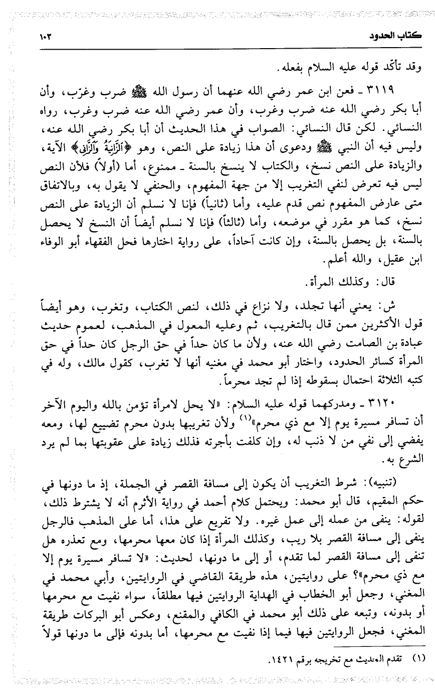 3119 فعن ابن عمر رضي الله عنهما أن رسول الله ضرب وغرّب ، وأن أبا بكر رضي الله عنه ضرب وغرب ، وأن عمر رضي الله عنه ضرب وغرب ، رواه النسائي . لكن قال النسائي : الصواب في هذا الحديث أن أبا بكر رضي الله عنه ، وليس فيه أن النبي ودعوى أن هذا زيادة على النص ، وهو 19 ( { الزانية والزاني } ) الآية ، والزيادة على النص نسخ ، والكتاب لا ينسخ بالسنة ممنوع ، أما ( أولاً ) فلأن النص ليس فيه تعرض لنفي التغريب إلا من جهة المفهوم ، والحنفي لا يقول به ، وبالاتفاق متى عارض المفهوم نص قدم عليه ، وأما ( ثانياً ) فإنا لا نسلم أن الزيادة على النص نسخ ، كما هو مقرر في موضعه ، وأما ( ثالثاً ) فإنا لا نسلم أيضاً أن النسخ لا يحصل بالسنة ، بل يحصل بالسنة ، وإن كانت آحاداً ، على رواية اختارها فحل الفقهاء أبو الوفاء ابن عقيل ، والله أعلم .
