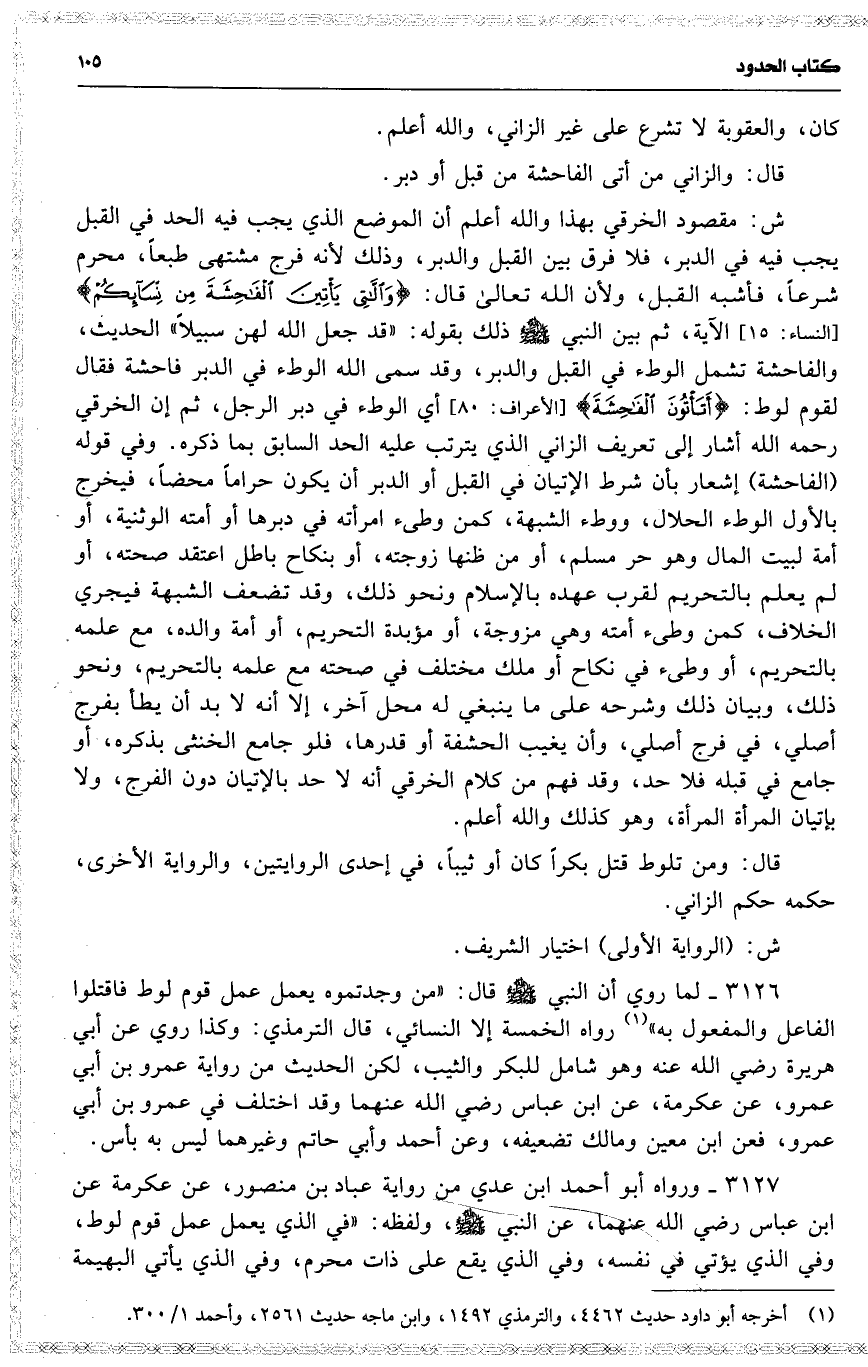 ش : مقصود الخرقي بهذا والله أعلم أن الموضع الذي يجب فيه الحد في القبل يجب فيه في الدبر ، فلا فرق بين القبل والدبر ، وذلك لأنه فرج مشتهى طبعاً ، محرم شرعاً ، فأشبه القبل ، ولأن الله تعالى قال : 19 ( { والاتي يأتين الفاحشة من نسائكم } ) الآية ، ثم بين النبي ذلك بقوله : ( قد جعل الله لهن سبيلاً ) الحديث ، والفاحشة تشمل الوطء في القبل والدبر ، وقد سمى الله الوطء في الدبر فاحشة فقال لقوم لوط : 19 ( { أتأتون الفاحشة } ) أي الوطء في دبر الرجل ، ثم إن الخرقي رحمه الله أشار إلى تعريف الزاني الذي يترتب عليه الحد السابق بما ذكره . وفي قوله ( الفاحشة ) إشعار بأن شرط الإتيان في القبل أو الدبر أن يكون حراماً محضاً ، فيخرج بالأول الوطء الحلال ، ووطء الشبهة ، كمن وطىء امرأته في دبرها أو أمته الوثنية ، أو أمة لبيت المال وهو حر مسلم ، أو من ظنها زوجته ، أو بنكاح باطل اعتقد صحته ، أو لم يعلم بالتحريم لقرب عهده بالإسلام ونحو ذلك ، وقد تضعف الشبهة فيجري الخلاف ، كمن وطىء أمته وهي مزوجة ، أو مؤبدة التحريم ، أو أمة والده ، مع علمه بالتحريم ، أو وطىء في نكاح أو ملك مختلف في صحته مع علمه بالتحريم ، ونحو ذلك ، وبيان ذلك وشرحه على ما ينبغي له محل آخر ، إلا أنه لا بد أن يطأ بفرج أصلي ، في فرج أصلي ، وأن يغيب الحشفة أو قدرها ، فلو جامع الخنثى بذكره ، أو جامع في قبله فلا حد ، وقد فهم من كلام الخرقي أنه لا حد بالإتيان دون الفرج ، ولا بإتيان المرأة المرأة ، وهو كذلك والله أعلم .