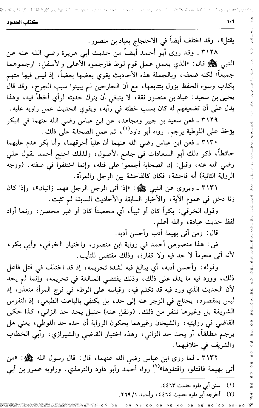 3128 وقد روى أبو أحمد أيضاً من حديث أبي هريرة رضي الله عنه عن النبي قال : ( الذي يعمل عمل قوم لوط فارجموه الأعلى والأسفل ، ارجموهما جميعاً ) لكنه ضعفه ، وبالجملة هذه الأحاديث يقوي بعضها بعضاً ، إذ ليس فيها متهم بكذب وسوء الحفظ يزول بتتابعها ، مع أن الجارحين لم يبينوا سبب الجرح ، وقد قال يحيى بن سعيد : عباد بن منصور ثقة ، لا ينبغي أن يترك حديثه لرأي أخطأ فيه ، وهذا يدل على أن تضعيفهم له كان بسبب خطئه في رأيه ، ويقوي الحديث عمل راويه عليه .