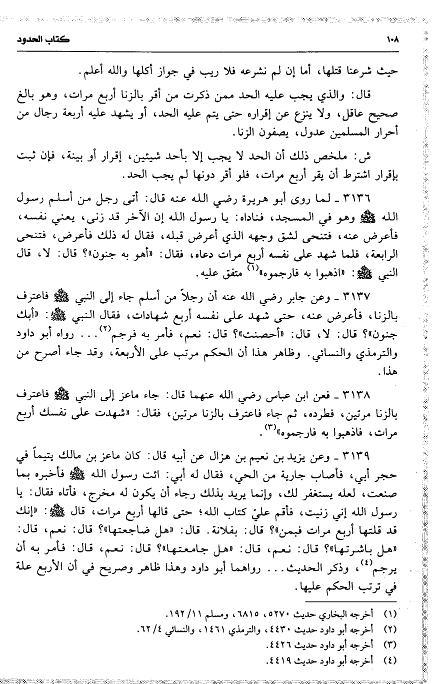 3136 لما روى أبو هريرة رضي الله عنه قال : أتى رجل من أسلم رسول الله وهو في المسجد ، فناداه : يا رسول الله إن الآخر قد زنى ، يعني نفسه ، فأعرض عنه ، فتنحى لشق وجهه الذي أعرض قبله ، فقال له ذلك فأعرض ، فتنحى الرابعة ، فلما شهد على نفسه أربع مرات دعاه ، فقال : ( أهو به جنون ) ؟ قال : لا ، قال النبي : ( اذهبوا به فارجموه ) متفق عليه .