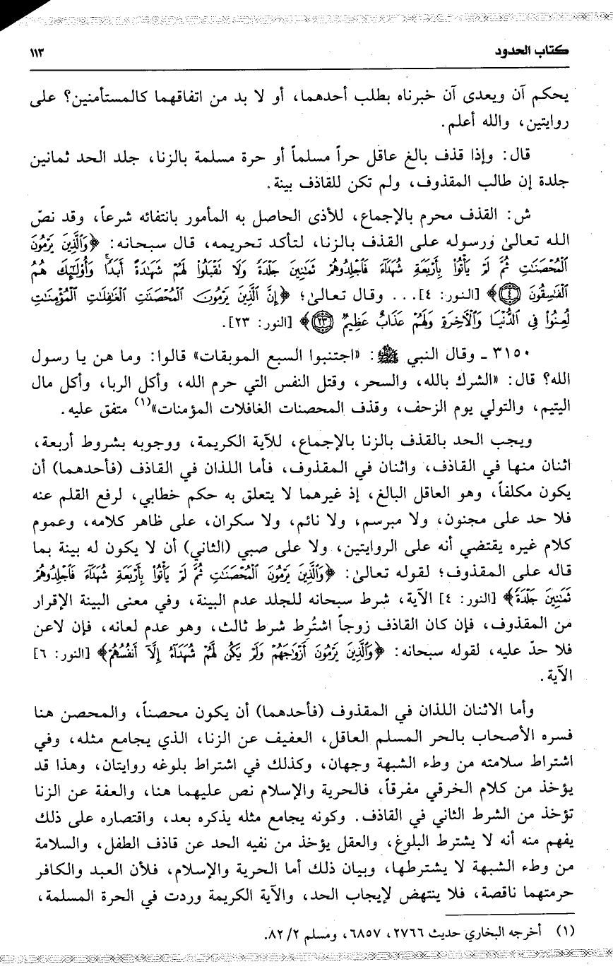 وأما الاثنان اللذان في المقذوف ( فأحدهما ) أن يكون محصناً ، والمحصن هنا فسره الأصحاب بالحر المسلم العاقل ، العفيف عن الزنا ، الذي يجامع مثله ، وفي اشتراط سلامته من وطء الشبهة وجهان ، وكذلك في اشتراط بلوغه روايتان ، وهذا قد يؤخذ من كلام الخرقي مفرقاً ، فالحرية والإسلام نص عليهما هنا ، والعفة عن الزنا تؤخذ من الشرط الثاني في القاذف . وكونه يجامع مثله يذكره بعد ، واقتصاره على ذلك يفهم منه أنه لا يشترط البلوغ ، والعقل يؤخذ من نفيه الحد عن قاذف الطفل ، والسلامة من وطء الشبهة لا يشترطها ، وبيان ذلك أما الحرية والإسلام ، فلأن العبد والكافر حرمتهما ناقصة ، فلا ينتهض لإيجاب الحد ، والآية الكريمة وردت في الحرة المسلمة ،