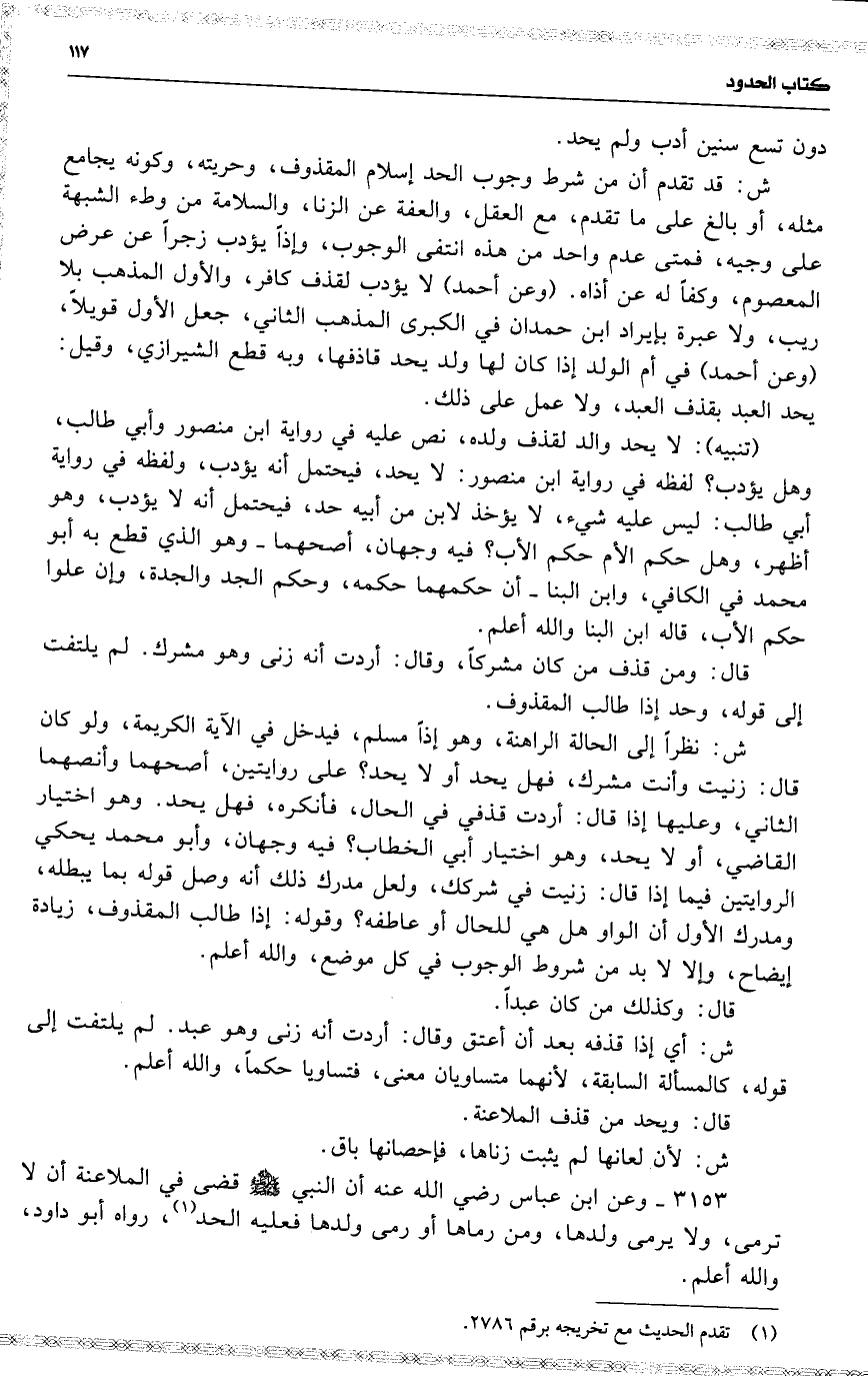 ش : قد تقدم أن من شرط وجوب الحد إسلام المقذوف ، وحريته ، وكونه يجامع مثله ، أو بالغ على ما تقدم ، مع العقل ، والعفة عن الزنا ، والسلامة من وطء الشبهة على وجيه ، فمتى عدم واحد من هذه انتفى الوجوب ، وإذاً يؤدب زجراً عن عرض المعصوم ، وكفاً له عن أذاه . ( وعن أحمد ) لا يؤدب لقذف كافر ، والأول المذهب بلا ريب ، ولا عبرة بإيراد ابن حمدان في الكبرى المذهب الثاني ، جعل الأول قويلاً ، ( وعن أحمد ) في أم الولد إذا كان لها ولد يحد قاذفها ، وبه قطع الشيرازي ، وقيل : يحد العبد بقذف العبد ، ولا عمل على ذلك .