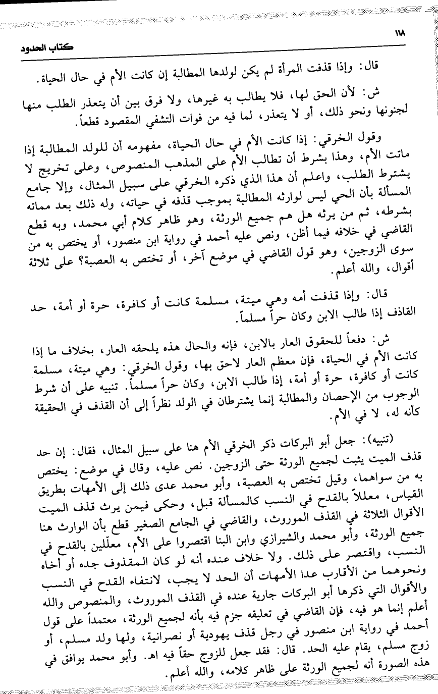 ( تنبيه ) : جعل أبو البركات ذكر الخرقي الأم هنا على سبيل المثال ، فقال : إن حد قذف الميت يثبت لجميع الورثة حتى الزوجين . نص عليه ، وقال في موضع : يختص به من سواهما ، وقيل تختص به العصبة ، وأبو محمد عدى ذلك إلى الأمهات بطريق القياس ، معللاً بالقدح في النسب كالمسألة قبل ، وحكى فيمن يرث قذف الميت الأقوال الثلاثة في القذف الموروث ، والقاضي في الجامع الصغير قطع بأن الوارث هنا جميع الورثة ، وأبو محمد والشيرازي وابن البنا اقتصروا على الأم ، معلّلين بالقدح في النسب ، واقتصر على ذلك . ولا خلاف عنده أنه لو كان المقذوف جده أو أخاه ونحوهما من الأقارب عدا الأمهات أن الحد لا يجب ، لانتفاء القدح في النسب والأقوال التي ذكرها أبو البركات جارية عنده في القذف الموروث ، والمنصوص والله أعلم إنما هو فيه ، فإن القاضي في تعليقه جزم فيه بأنه لجميع الورثة ، معتمداً على قول أحمد في رواية ابن منصور في رجل قذف يهودية أو نصرانية ، ولها ولد مسلم ، أو زوج مسلم ، يقام عليه الحد . قال : فقد جعل للزوج حقاً فيه اه . وأبو محمد يوافق في هذه الصورة أنه لجميع الورثة على ظاهر كلامه ، والله أعلم .