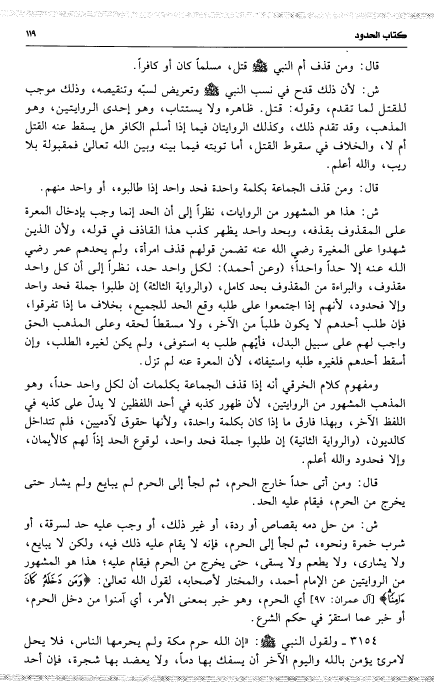 ش : من حل دمه بقصاص أو ردة ، أو غير ذلك ، أو وجب عليه حد لسرقة ، أو شرب خمرة ونحوه ، ثم لجأ إلى الحرم ، فإنه لا يقام عليه ذلك فيه ، ولكن لا يبايع ، ولا يشارى ، ولا يطعم ولا يسقى ، حتى يخرج من الحرم فيقام عليه ؛ هذا هو المشهور من الروايتين عن الإمام أحمد ، والمختار لأصحابه ، لقول الله تعالى : 19 ( { ومن دخله كان آمناً } ) أي الحرم ، وهو خبر بمعنى الأمر ، أي آمنوا من دخل الحرم ، أو خبر عما استقرّ في حكم الشرع .