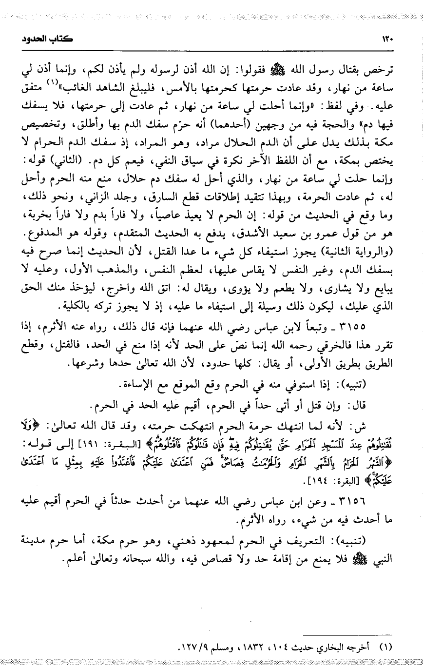 ترخص بقتال رسول الله فقولوا : إن الله أذن لرسوله ولم يأذن لكم ، وإنما أذن لي ساعة من نهار ، وقد عادت حرمتها كحرمتها بالأمس ، فليبلغ الشاهد الغائب ) متفق عليه . وفي لفظ : ( وإنما أحلت لي ساعة من نهار ، ثم عادت إلى حرمتها ، فلا يسفك فيها دم ) والحجة فيه من وجهين ( أحدهما ) أنه حرّم سفك الدم بها وأطلق ، وتخصيص مكة بذلك يدل على أن الدم الحلال مراد ، وهو المراد ، إذ سفك الدم الحرام لا يختص بمكة ، مع أن اللفظ الآخر نكرة في سياق النفي ، فيعم كل دم . ( الثاني ) قوله : وإنما حلت لي ساعة من نهار ، والذي أحل له سفك دم حلال ، منع منه الحرم وأحل له ، ثم عادت الحرمة ، وبهذا تتقيد إطلاقات قطع السارق ، وجلد الزاني ، ونحو ذلك ، وما وقع في الحديث من قوله : إن الحرم لا يعيذ عاصياً ، ولا فاراً بدم ولا فاراً بخربة ، هو من قول عمرو بن سعيد الأشدق ، يدفع به الحديث المتقدم ، وقوله هو المدفوع . ( والرواية الثانية ) يجوز استيفاء كل شيء ما عدا القتل ، لأن الحديث إنما صرح فيه بسفك الدم ، وغير النفس لا يقاس عليها ، لعظم النفس ، والمذهب الأول ، وعليه لا يبايع ولا يشارى ، ولا يطعم ولا يؤوى ، ويقال له : اتق الله واخرج ، ليؤخذ منك الحق الذي عليك ، ليكون ذلك وسيلة إلى استيفاء ما عليه ، إذ لا يجوز تركه بالكلية .