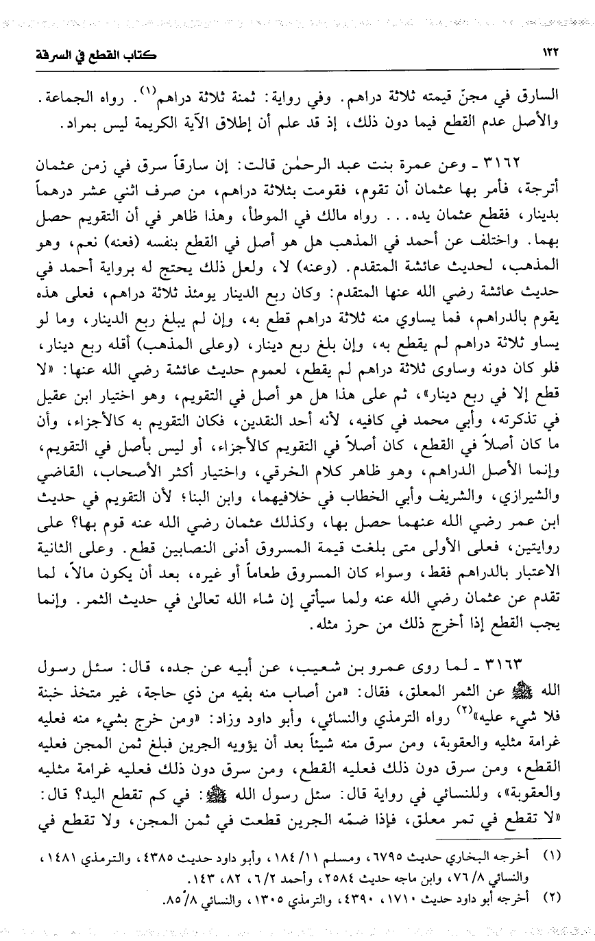 3163 لما روى عمرو بن شعيب ، عن أبيه عن جده ، قال : سئل رسول الله عن الثمر المعلق ، فقال : ( من أصاب منه بفيه من ذي حاجة ، غير متخذ خبنة فلا شيء عليه ) رواه الترمذي والنسائي ، وأبو داود وزاد : ( ومن خرج بشيء منه فعليه غرامة مثليه والعقوبة ، ومن سرق منه شيئاً بعد أن يؤويه الجرين فبلغ ثمن المجن فعليه القطع ، ومن سرق دون ذلك فعليه القطع ، ومن سرق دون ذلك فعليه غرامة مثليه والعقوبة ) ، وللنسائي في رواية قال : سئل رسول الله : في كم تقطع اليد ؟ قال : ( لا تقطع في تمر معلق ، فإذا ضمّه الجرين قطعت في ثمن المجن ، ولا تقطع في